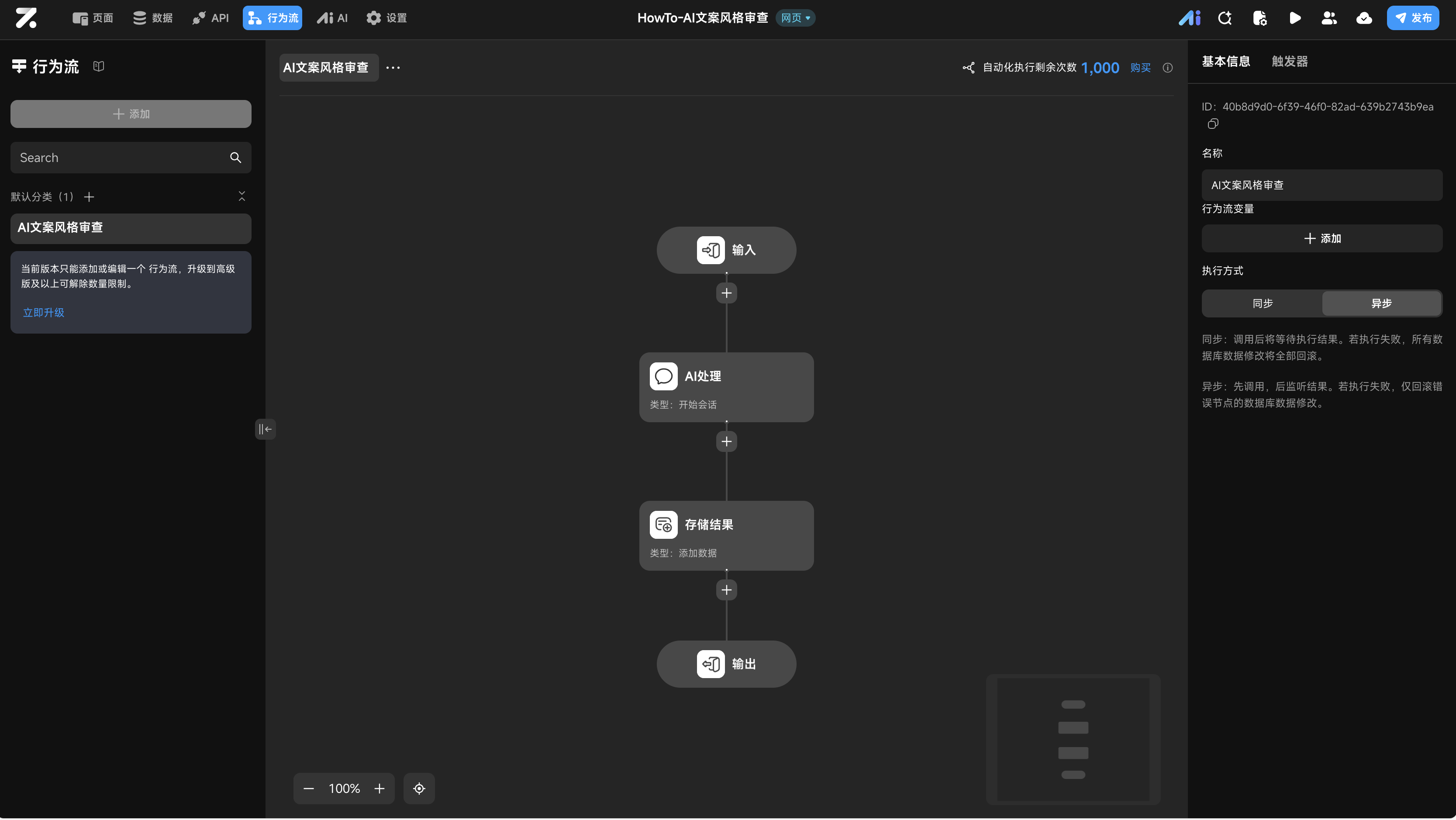 AI文案风格审查的行为流。 - 设置异步执行:在右侧面板将执行方式设置为 “异步”。