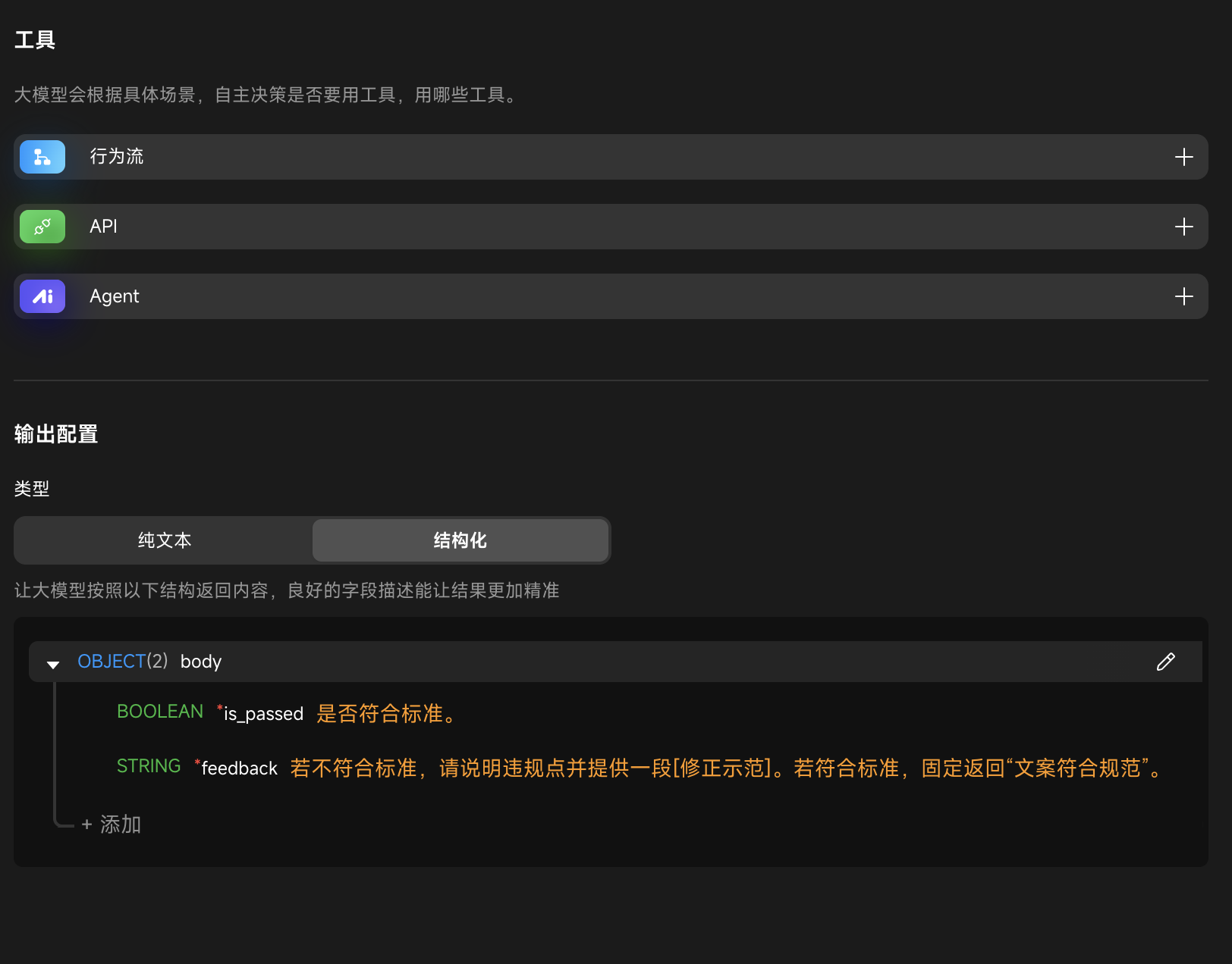 - 结构化输出:将输出类型设置为 “结构化”,添加以下字段: