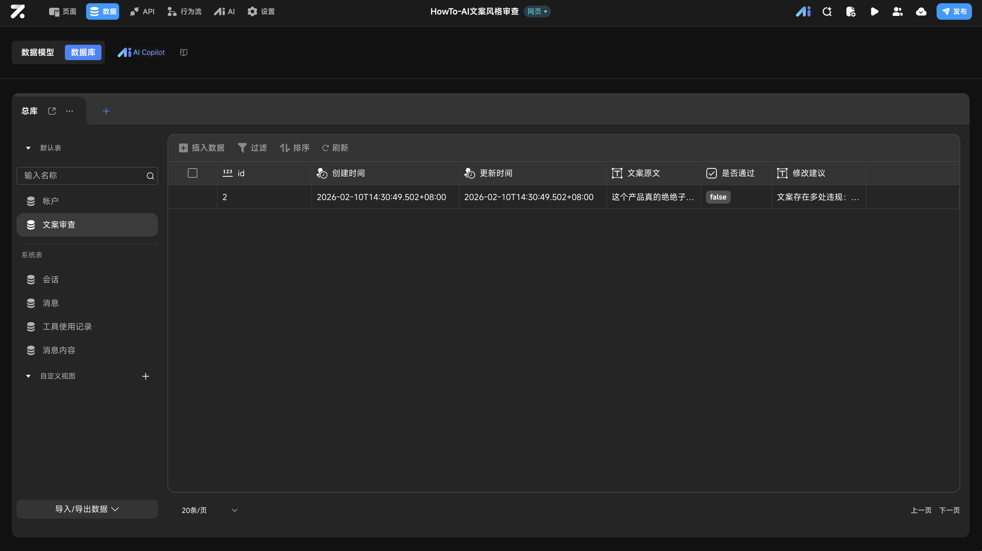 行为流数据 / 输入 / content->文案原文行为流数据 / AI处理 / data / is_passed->是否通过行为流数据 / AI处理 / data / feedback->修改建议