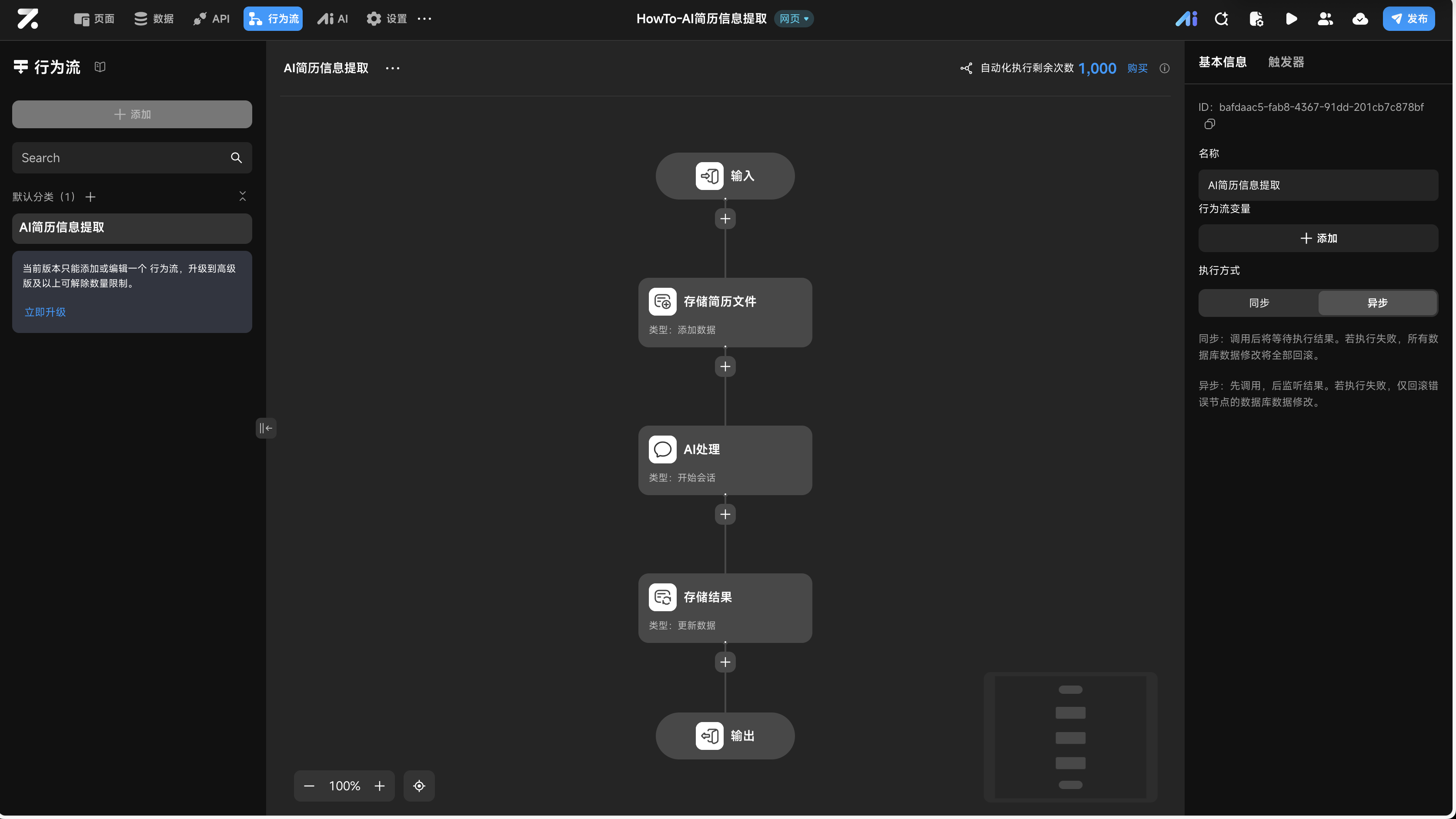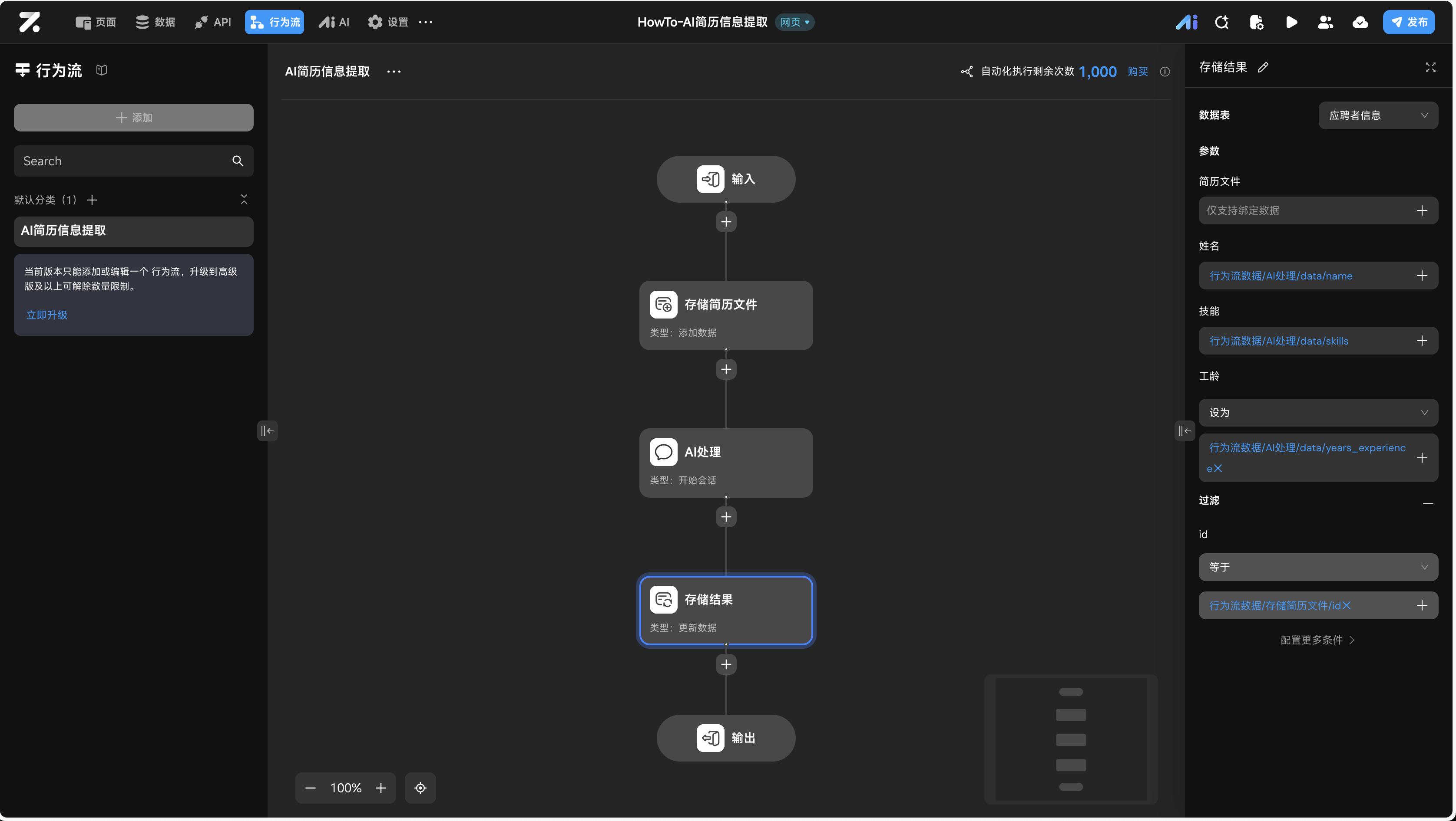 - 核心逻辑:通过页面组件上传文件至页面变量 -> 点击按钮触发行为流 -> 行为流保存文件、调用 AI Agent 并将解析后的数据更新至数据库记录中。