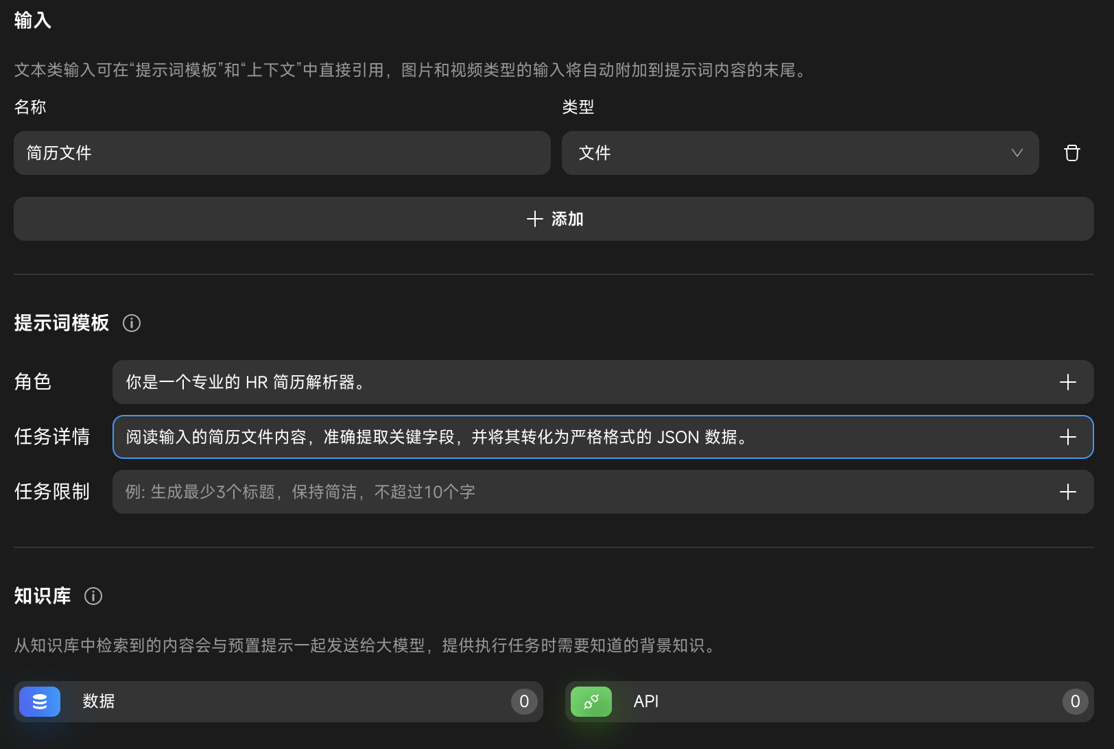 添加数据节点):将输入的resume文件存入应聘者信息表。 - AI 处理节点 (