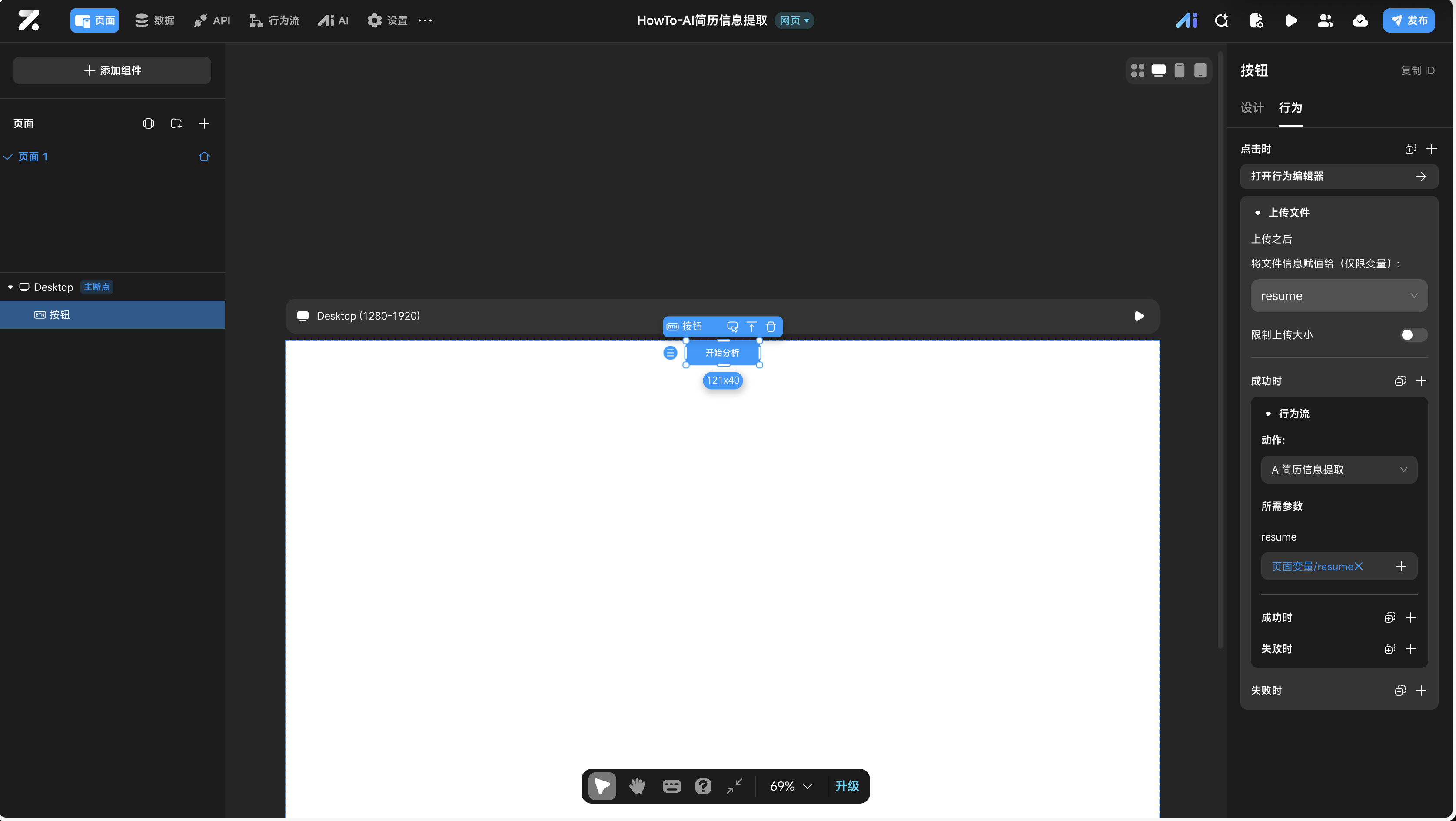 - 添加组件:在页面中放置一个 按钮,文本改为“开始分析”。
