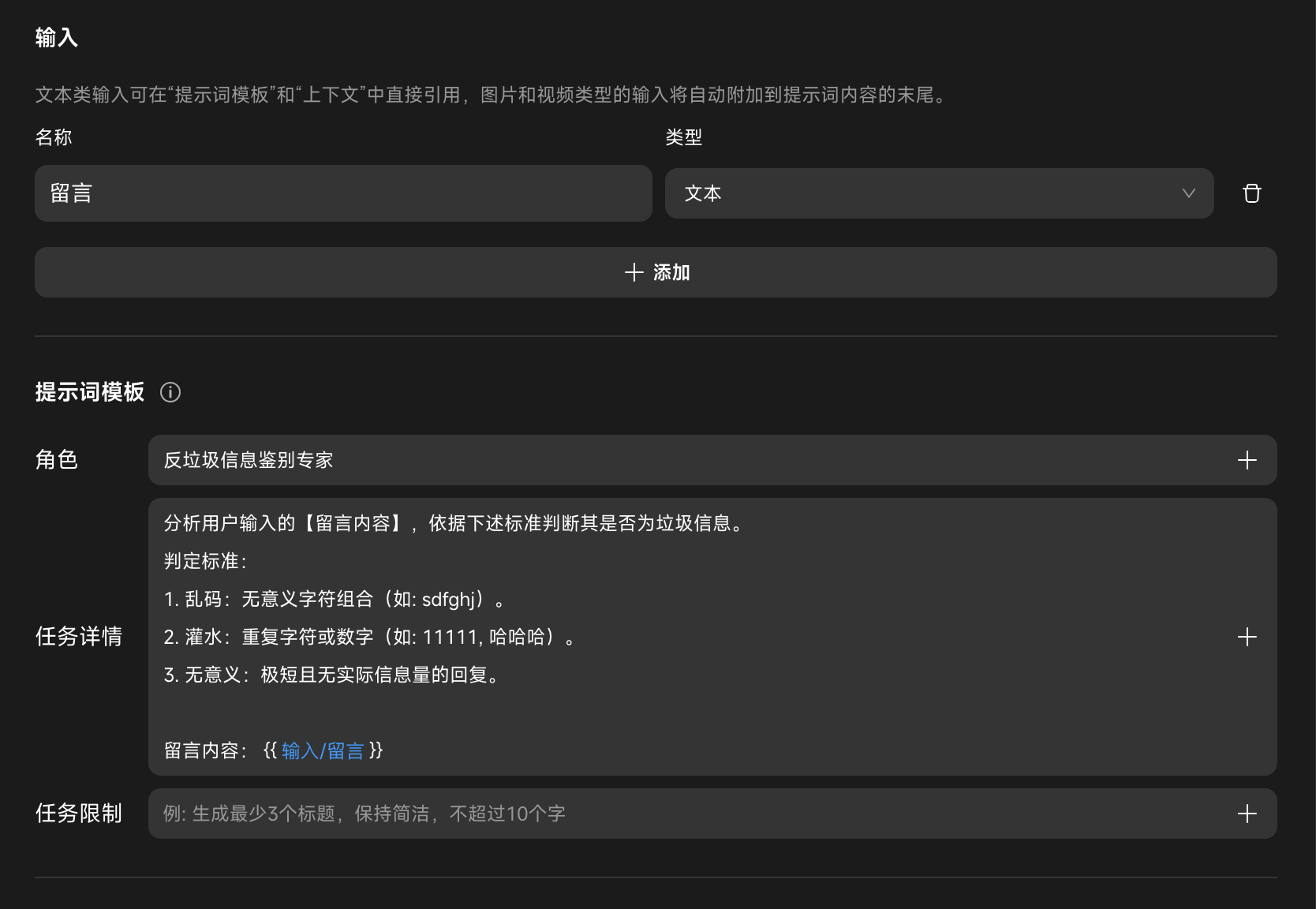 Agent_垃圾信息识别)。 - 输入设置:添加一个名为