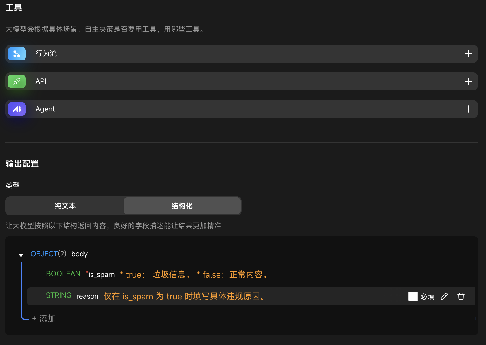 - 输出配置:务必将输出类型设置为“结构化”。这能确保 AI 返回格式化的 JSON 数据,方便后续逻辑节点直接调用。