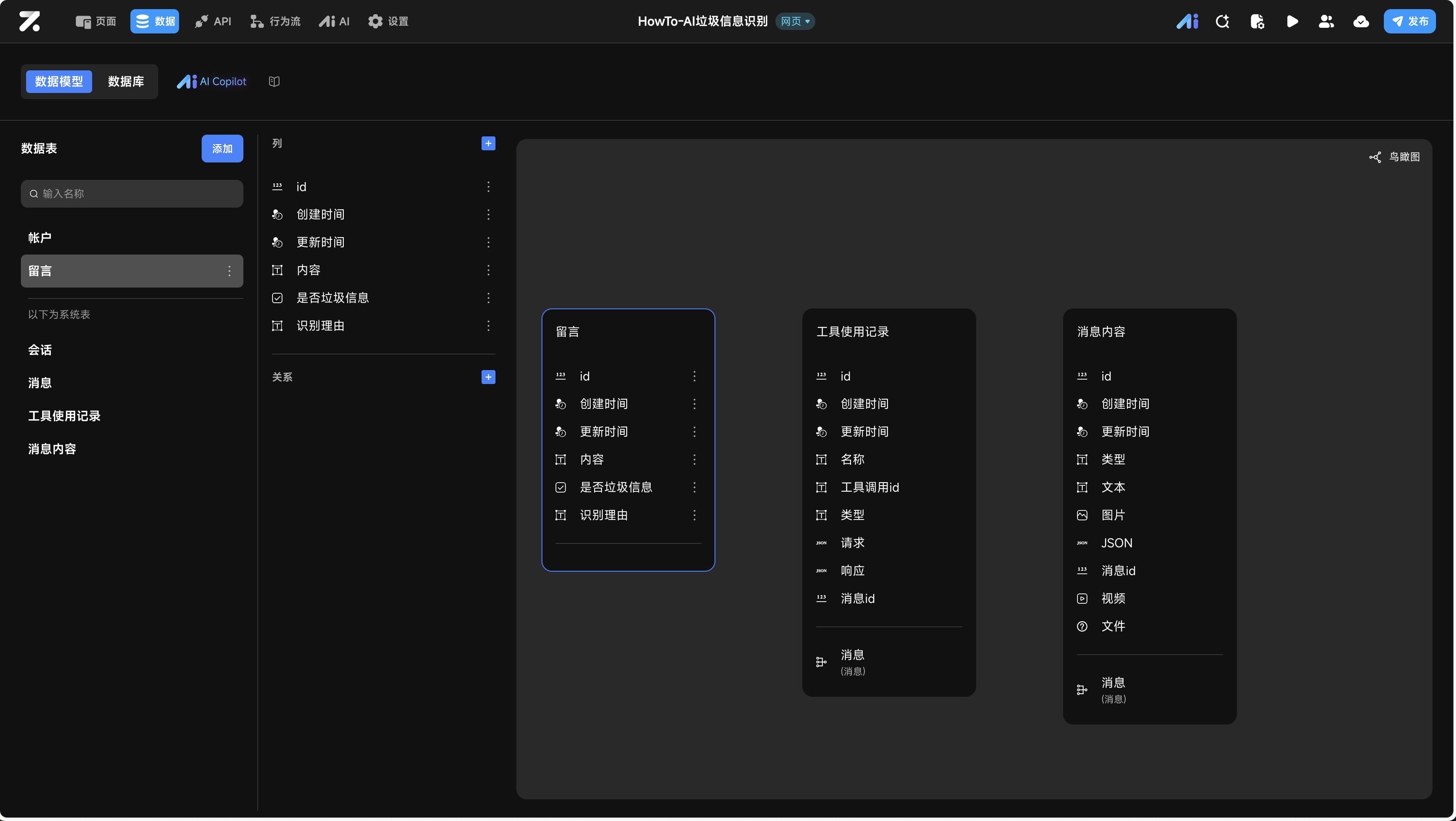 留言表。内容:绑定自行为流数据 -> 输入 -> content。是否垃圾信息:绑定自行为流数据 -> AI处理 -> data -> is_spam。识别理由:绑定自行为流数据 -> AI处理 -> data -> reason。