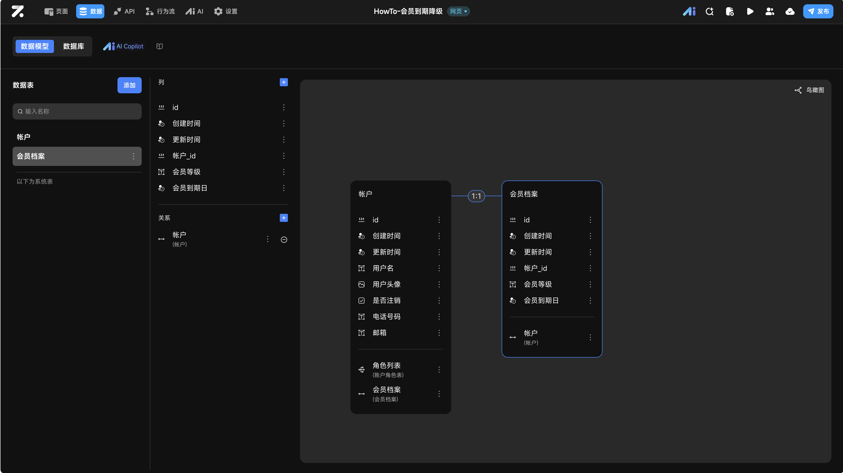 首先需要设计存储会员信息的表结构。由于系统自带的 帐户 表不支持手动插入数据,为了方便测试,可以创建一张关联表来管理会员档案。