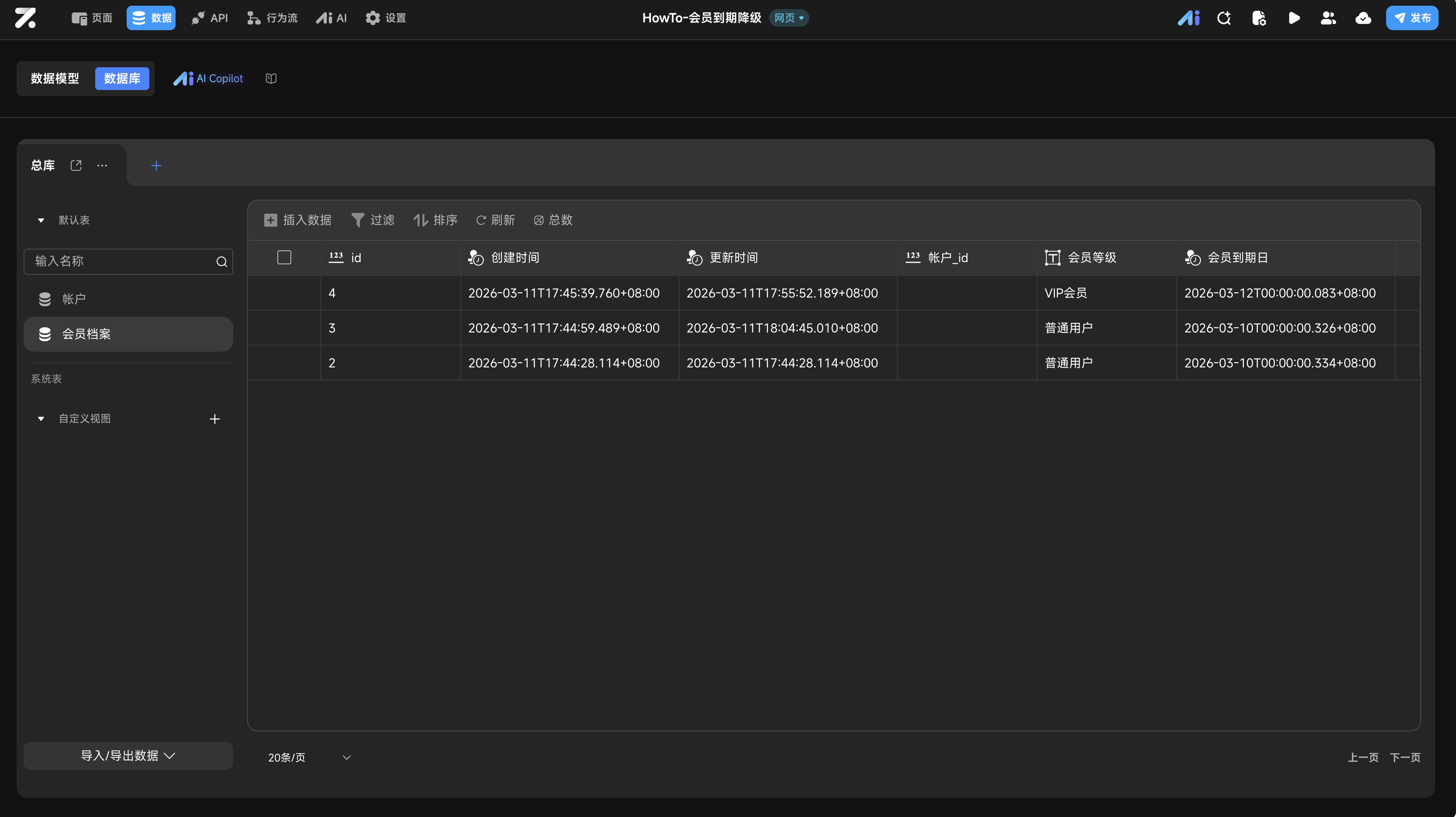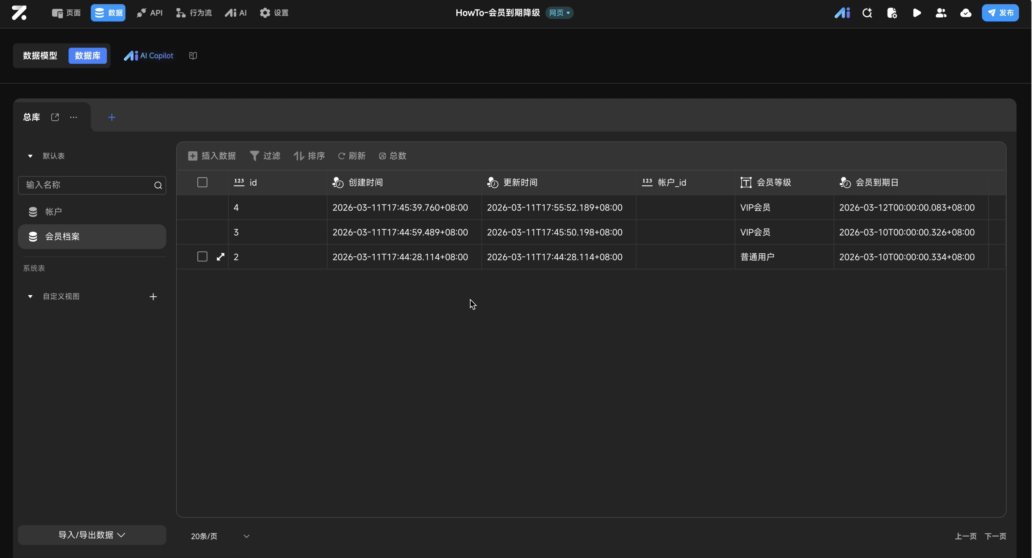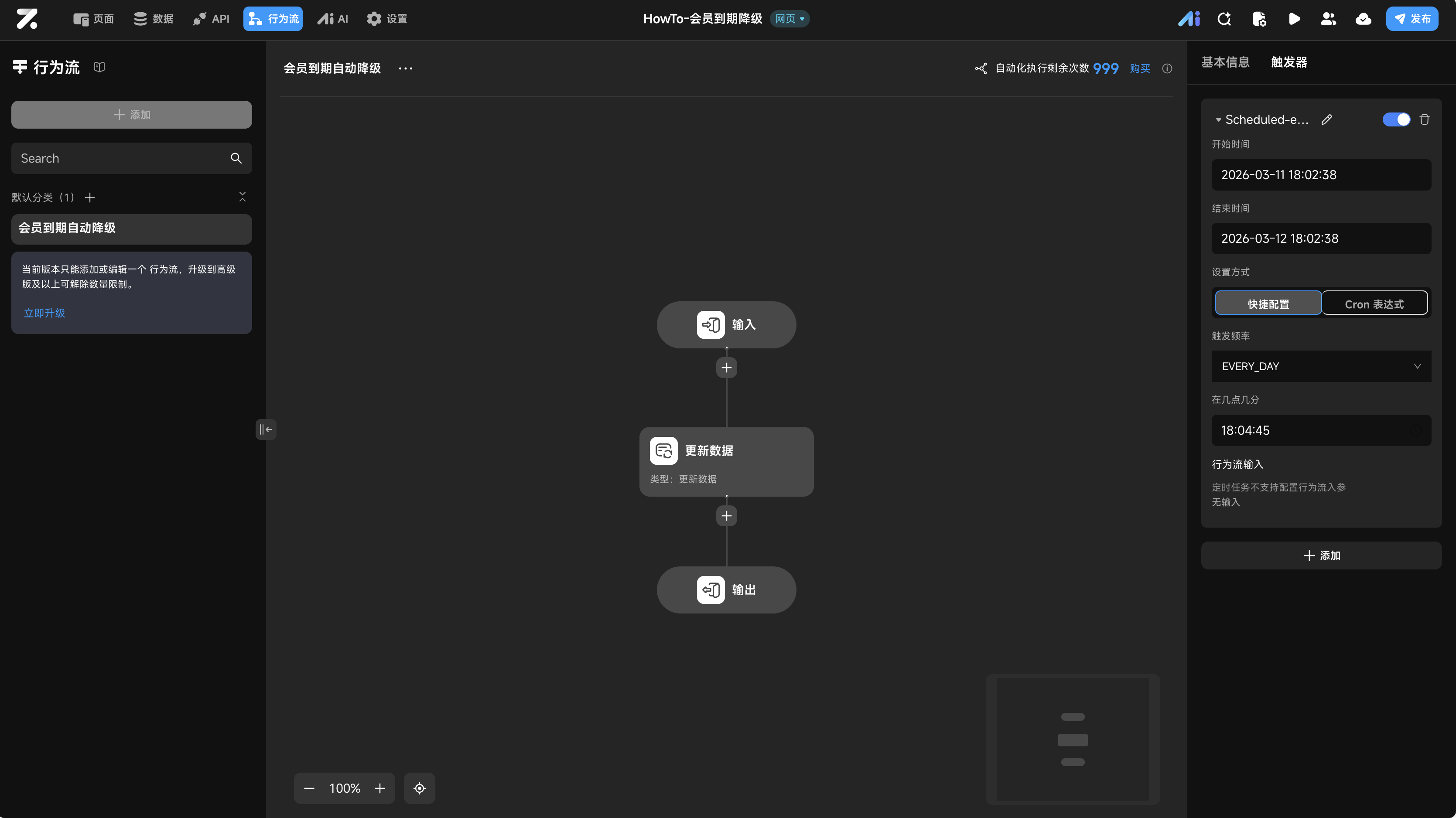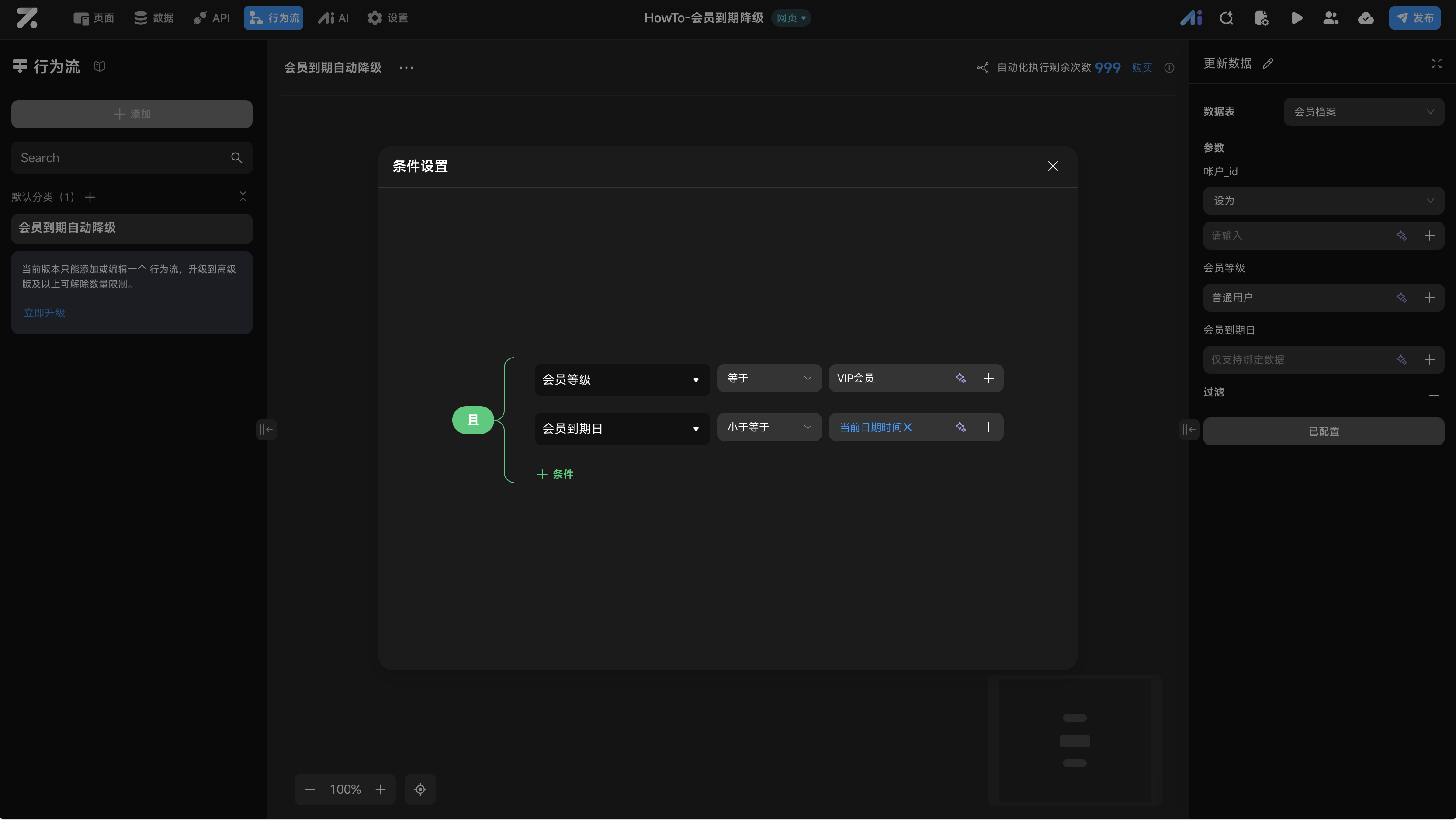 - 核心逻辑:在 行为流 中配置 定时触发器,定时检索数据库中“到期时间小于等于当前时间”且“状态为VIP”的记录,并执行批量更新操作。
