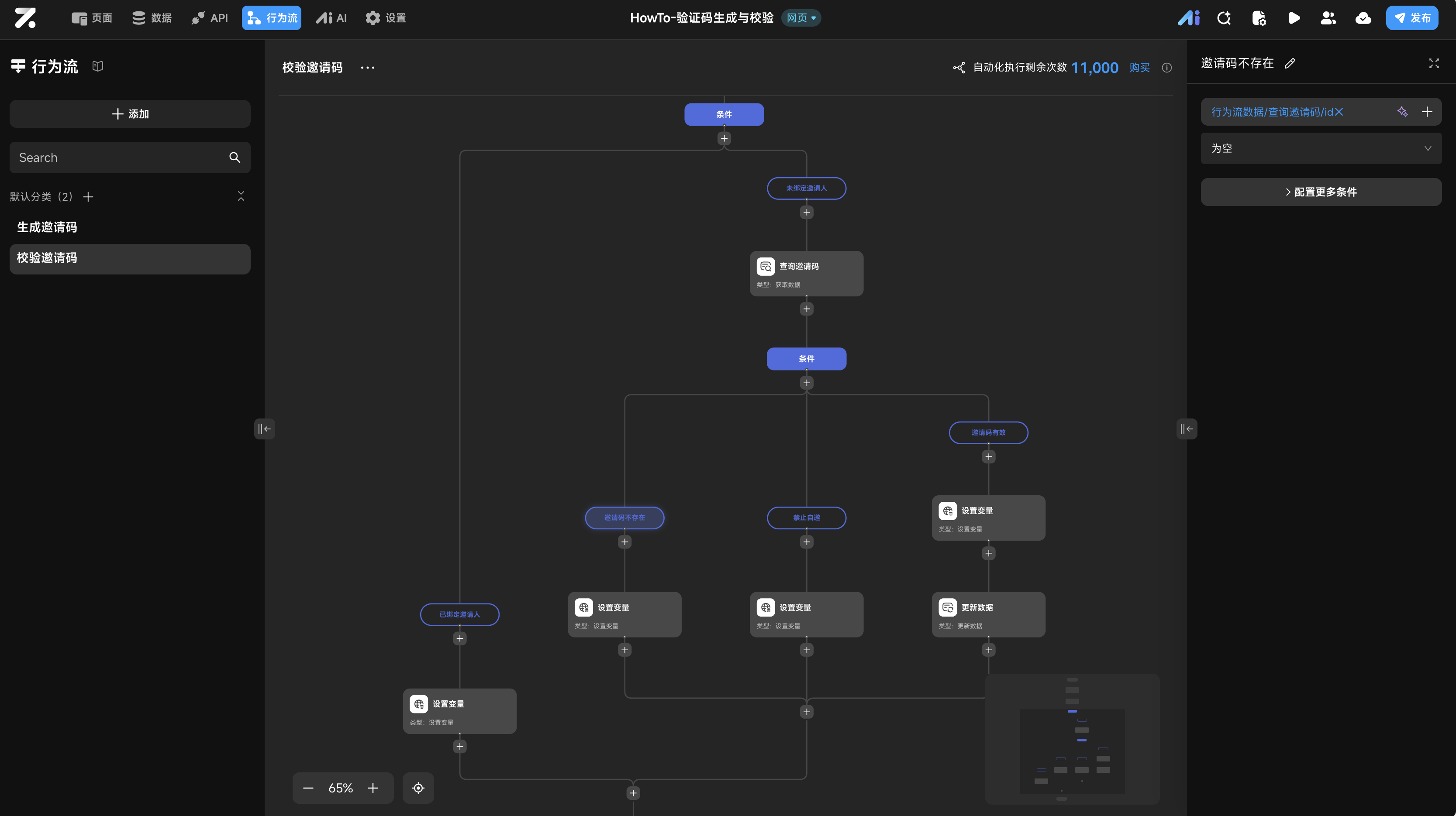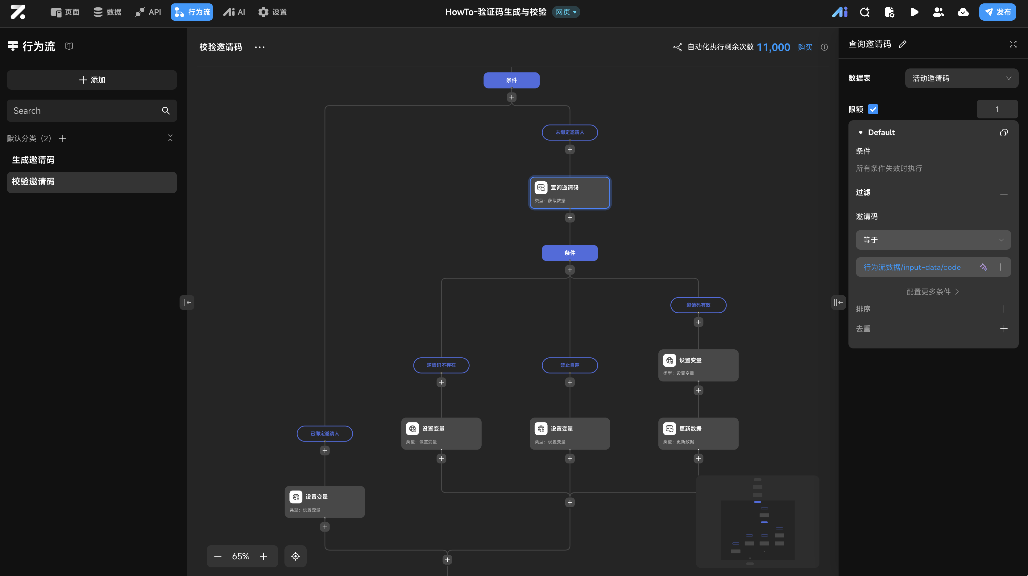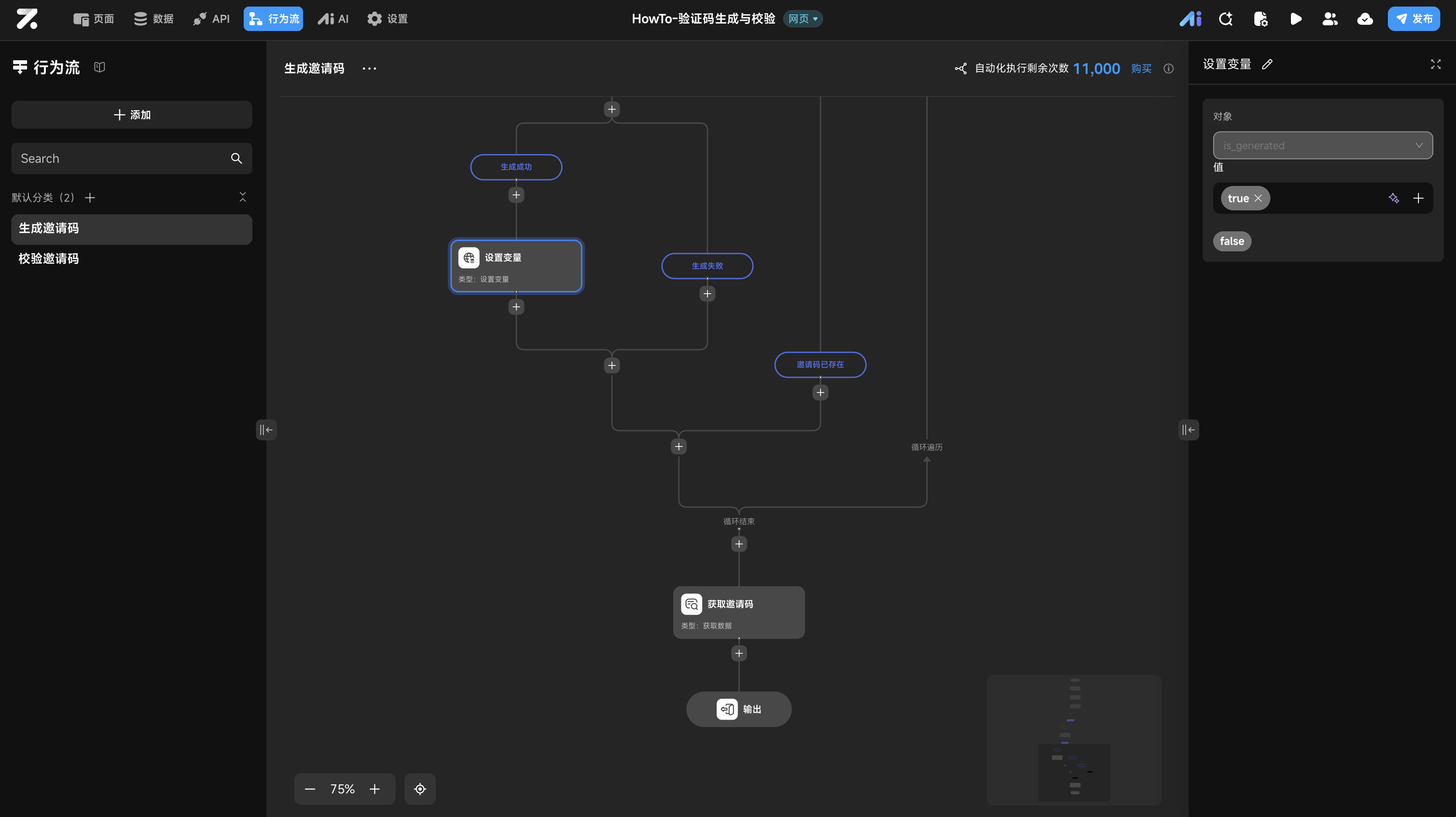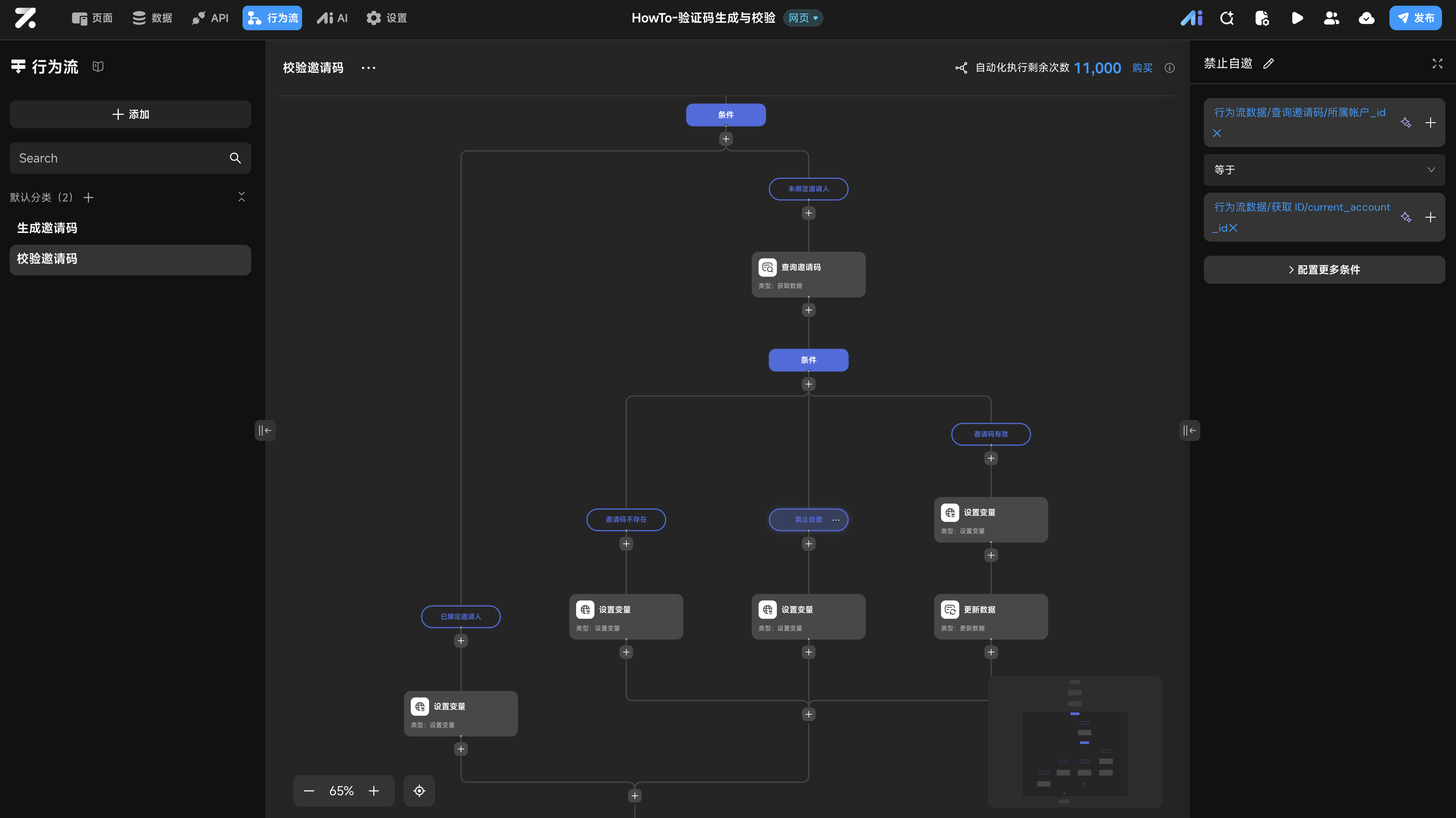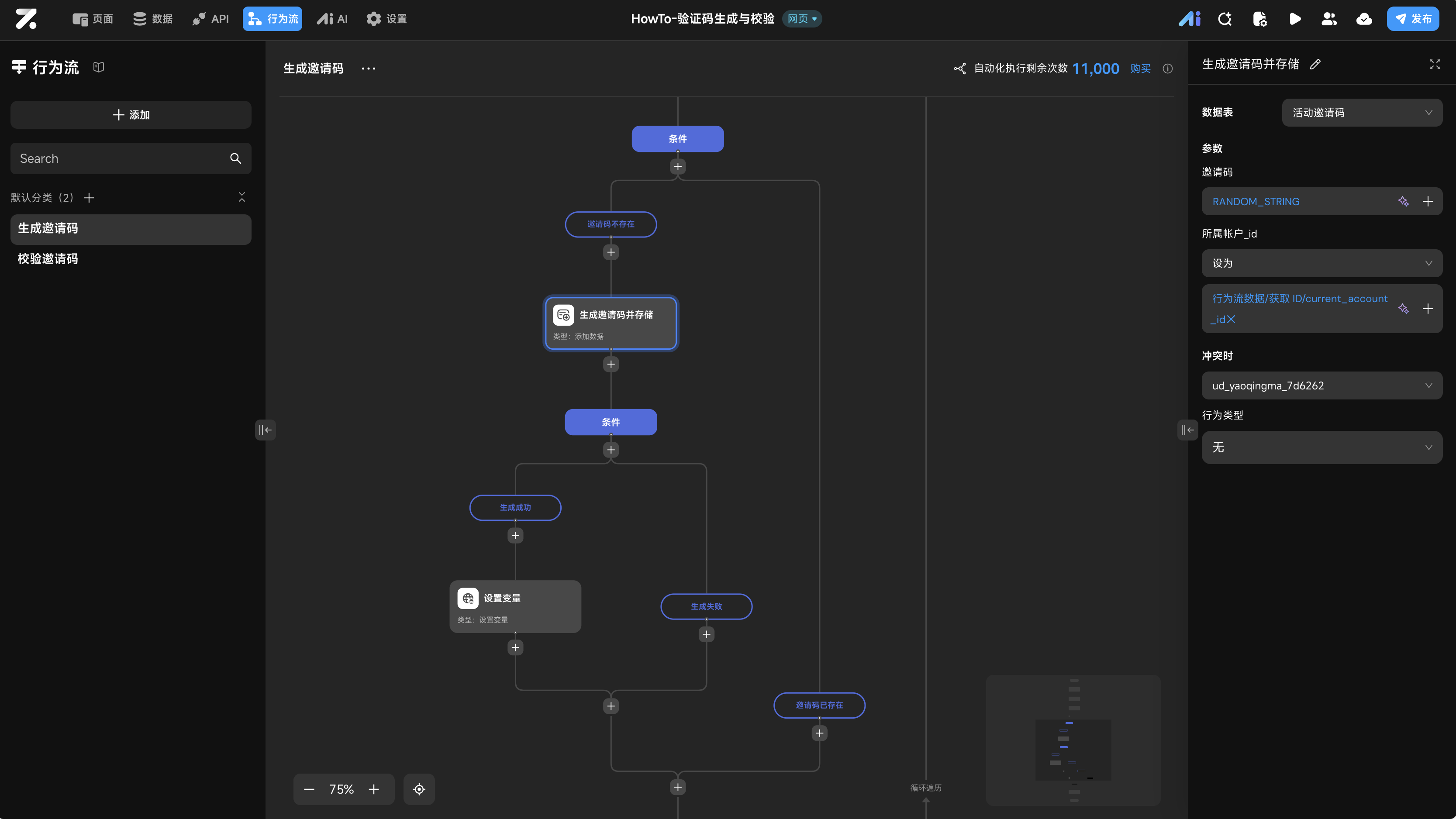 我们需要配置两个核心行为流:一个用于生成邀请码,一个用于校验并绑定。