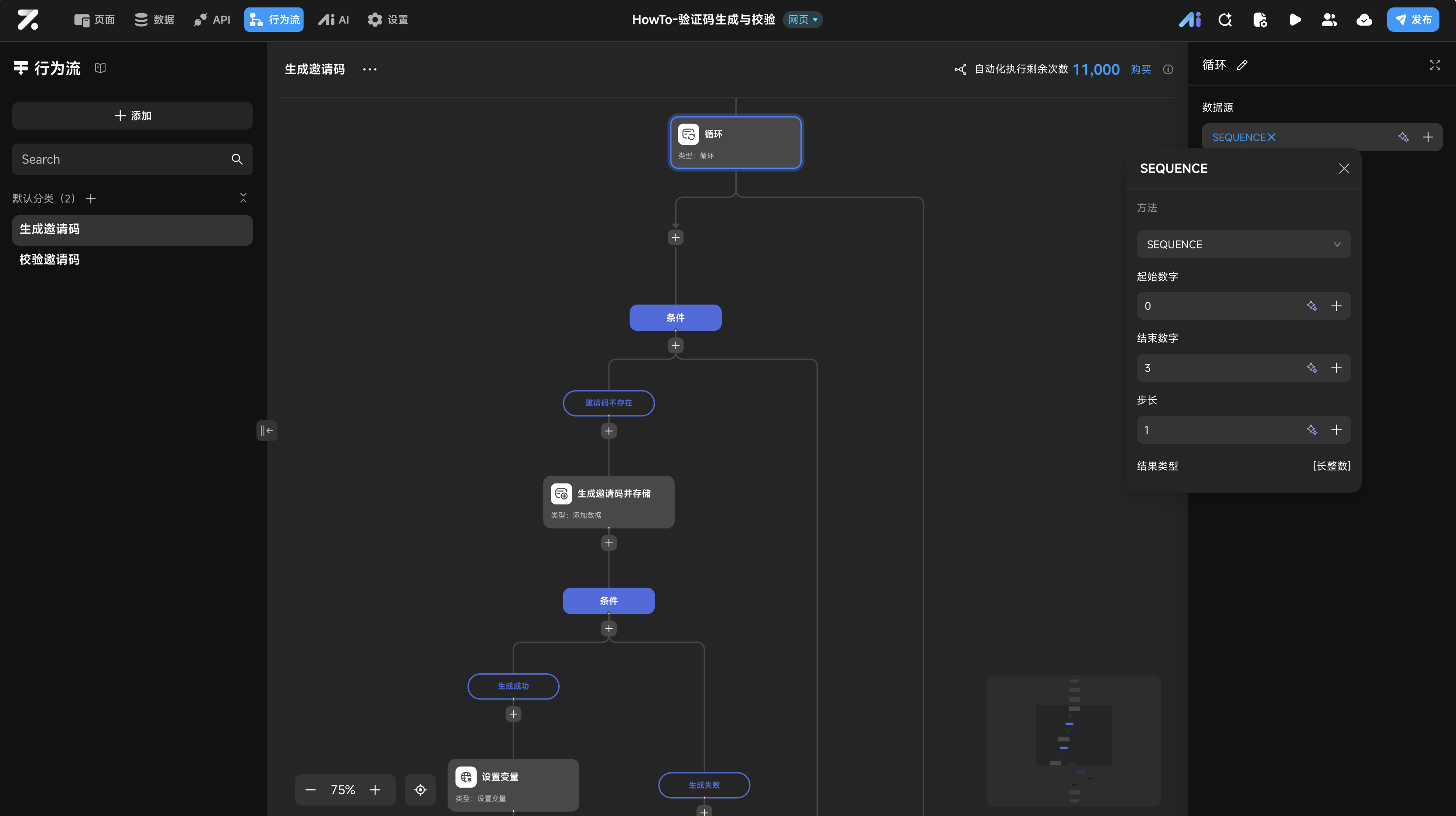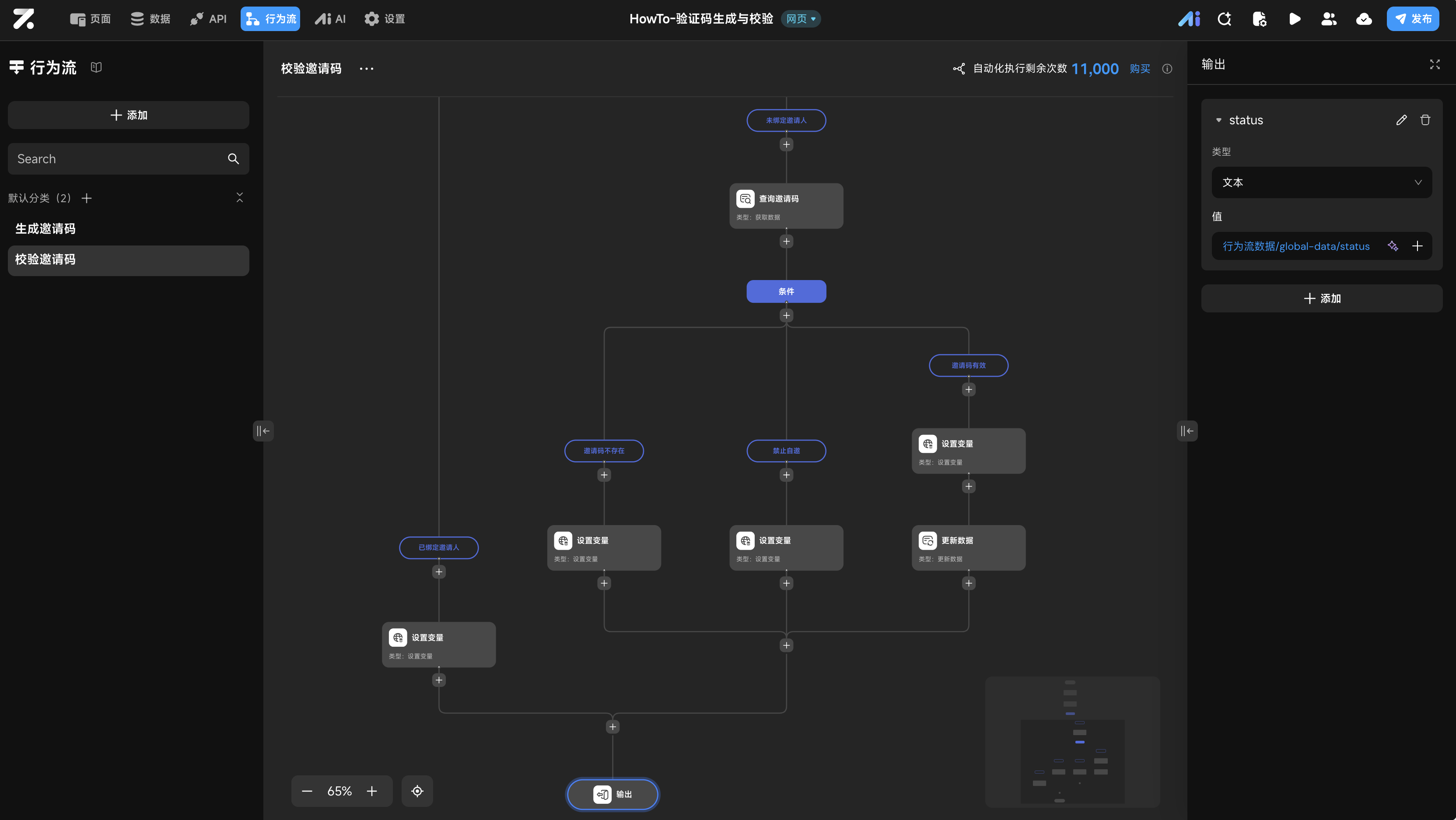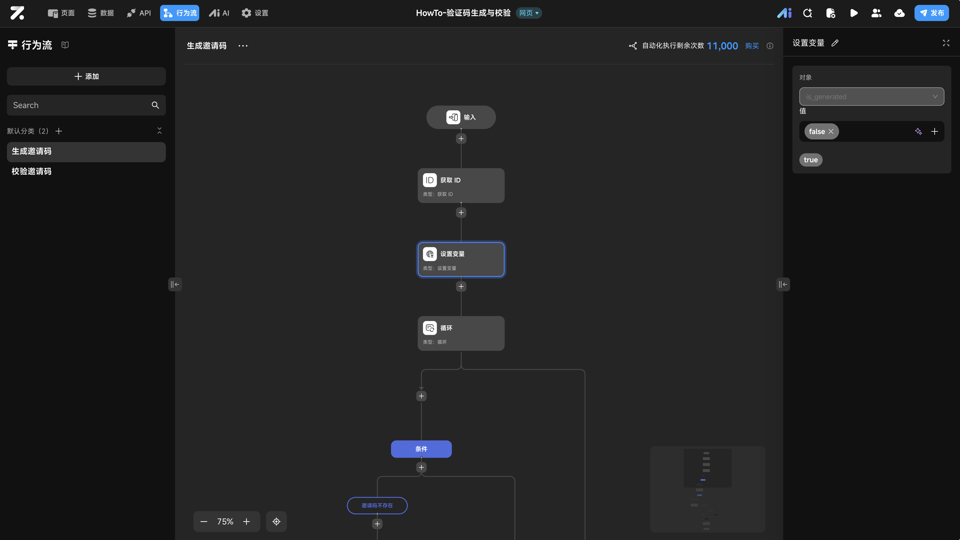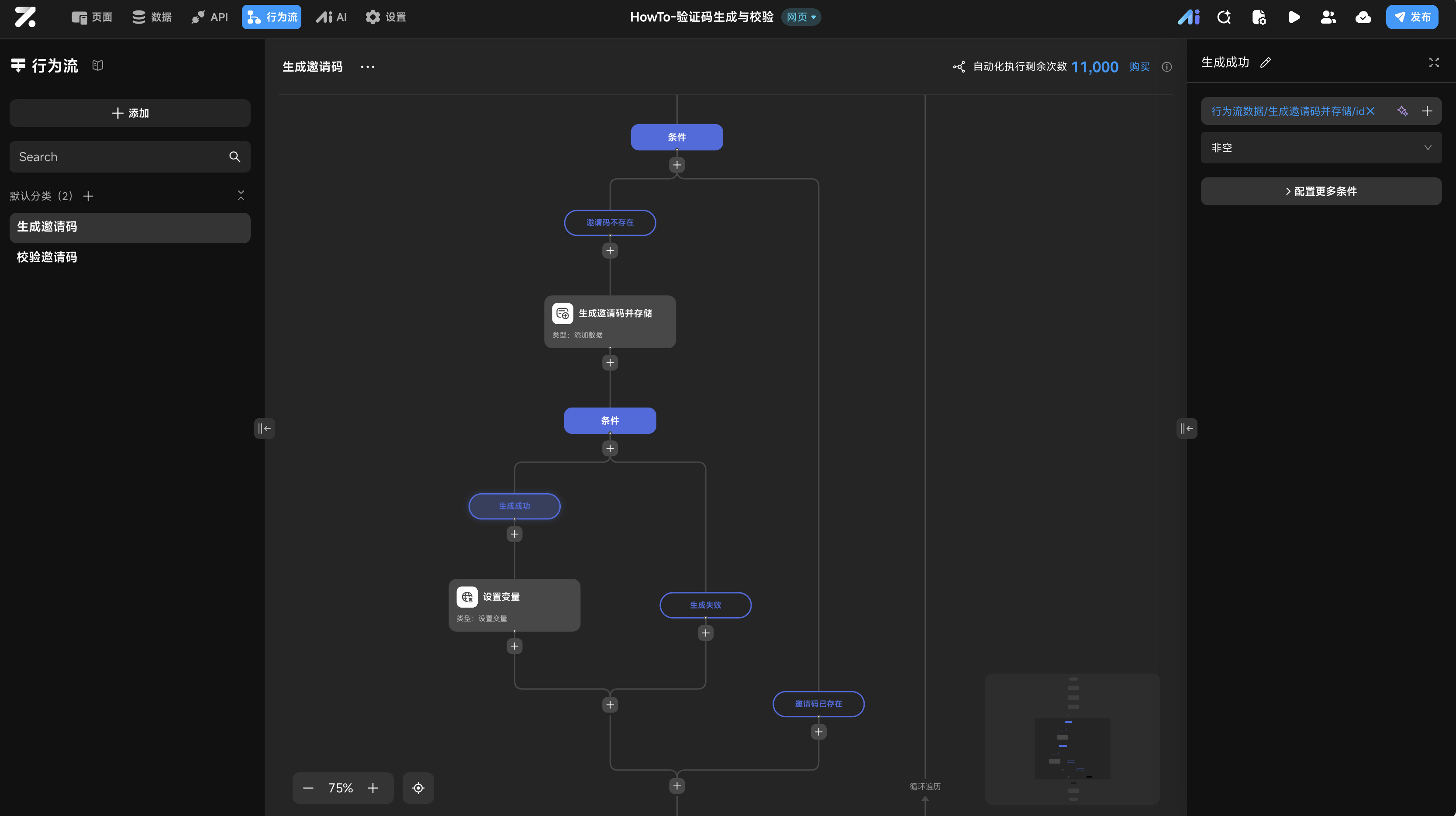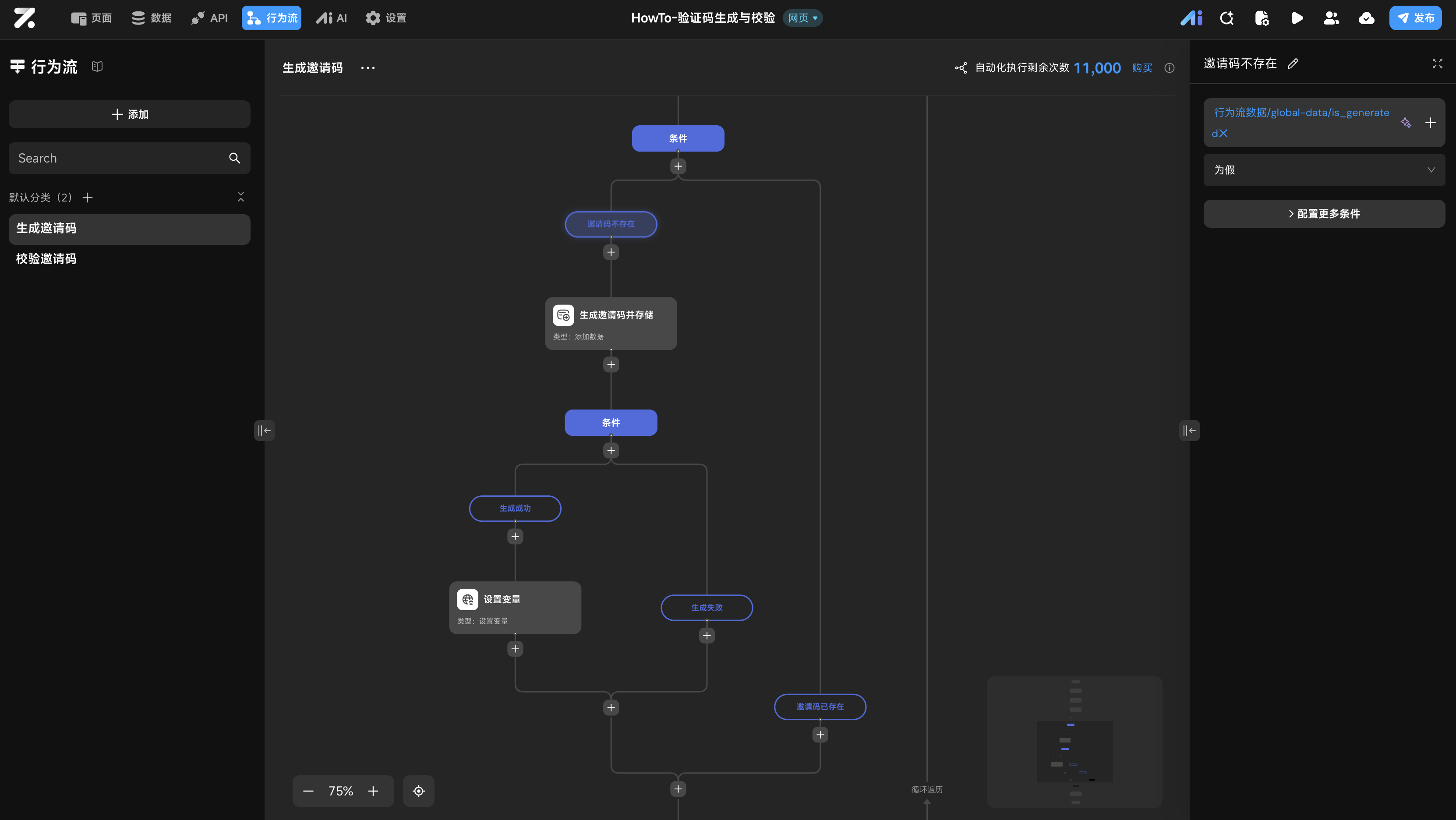 我们需要配置两个核心行为流:一个用于生成邀请码,一个用于校验并绑定。