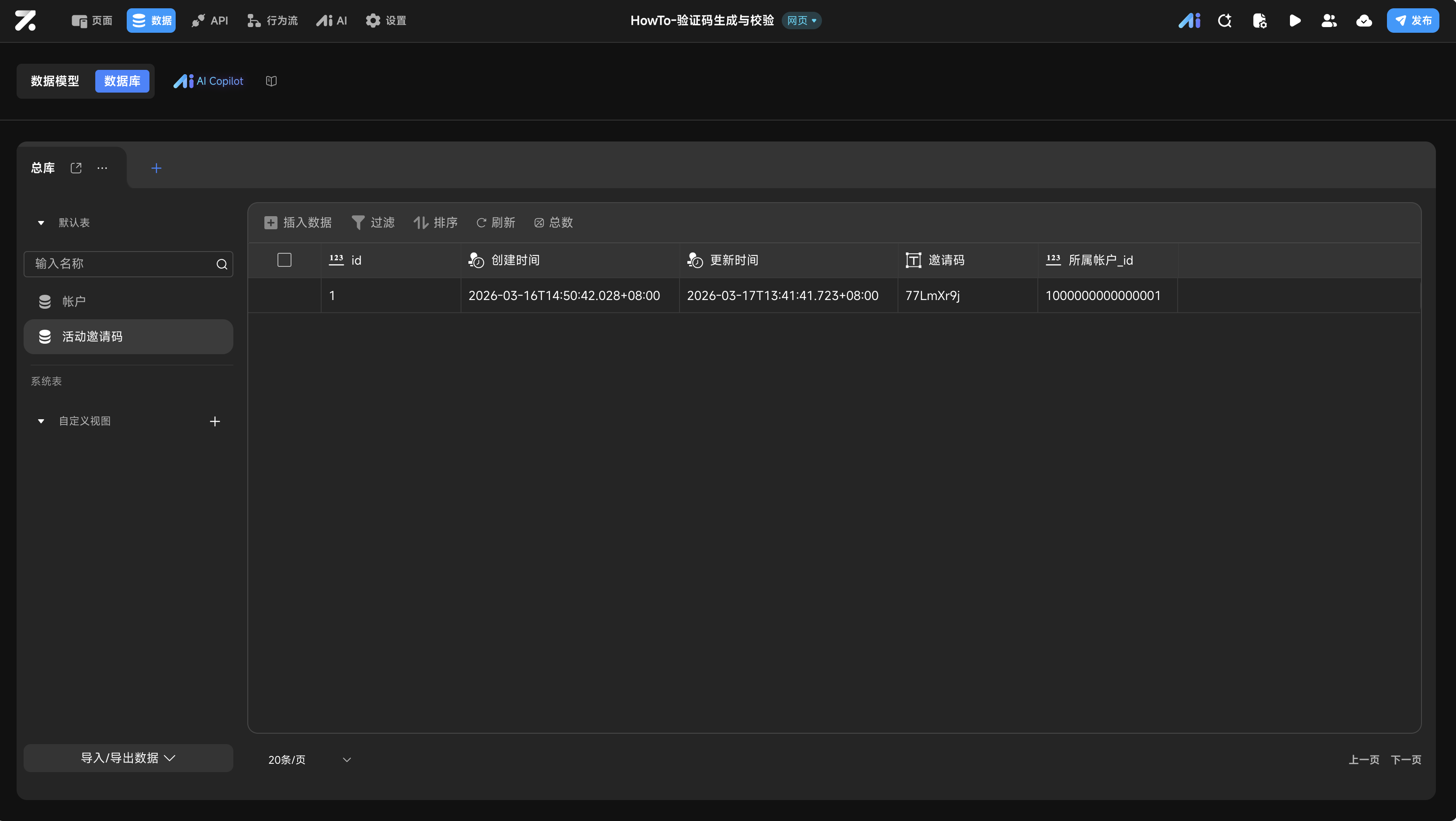 activity_invite_code表:确认邀请码77LmXr9j存在,且其owner_account_id对应用户 1 的系统 ID。 -