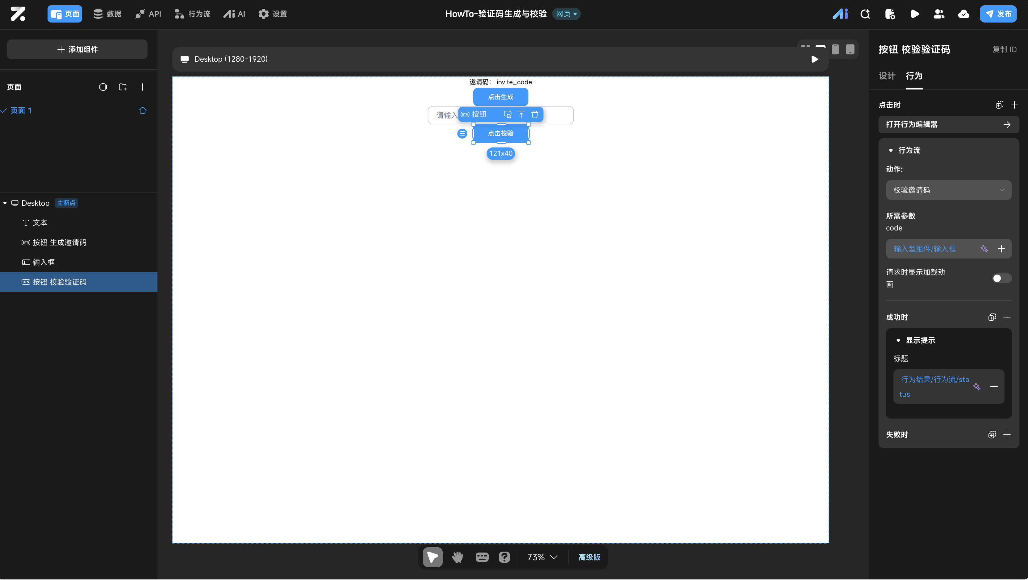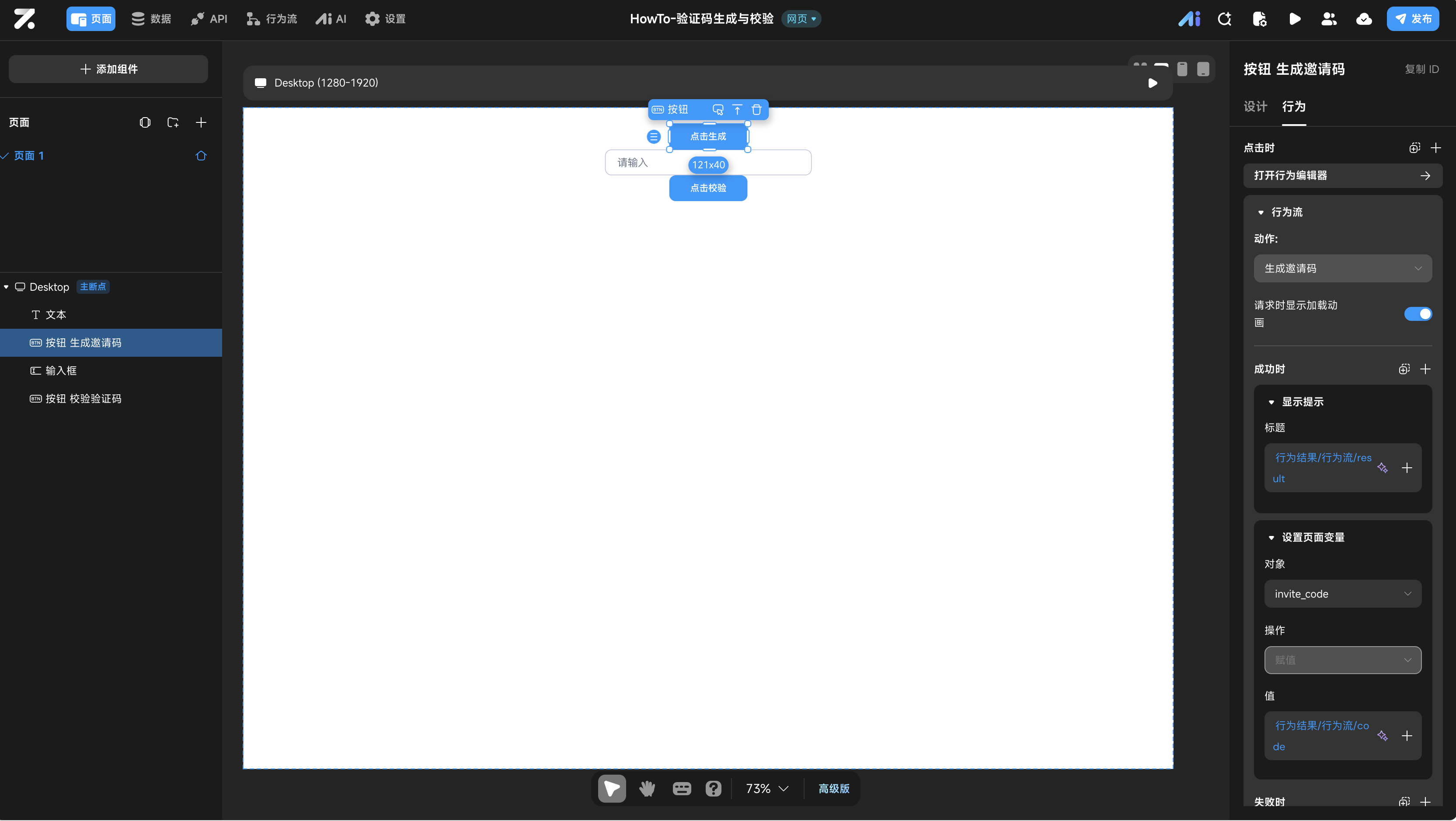 - 添加“按钮”,点击时调用“校验邀请码”行为流,参数