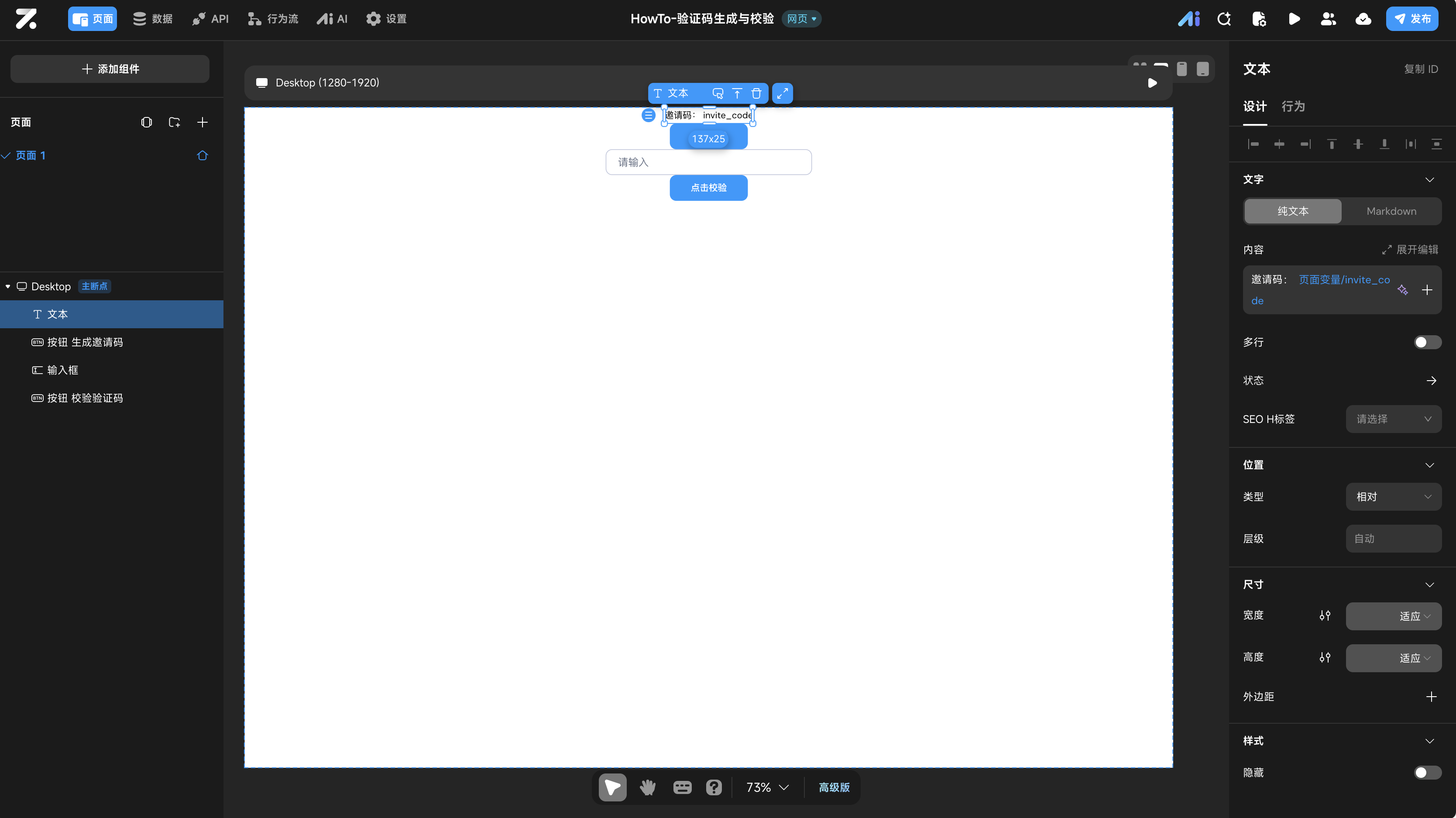 invite_code(文本),用于临时存放生成的邀请码。 - 文本展示:放置一个文本组件展示“我的邀请码”,内容绑定到页面变量