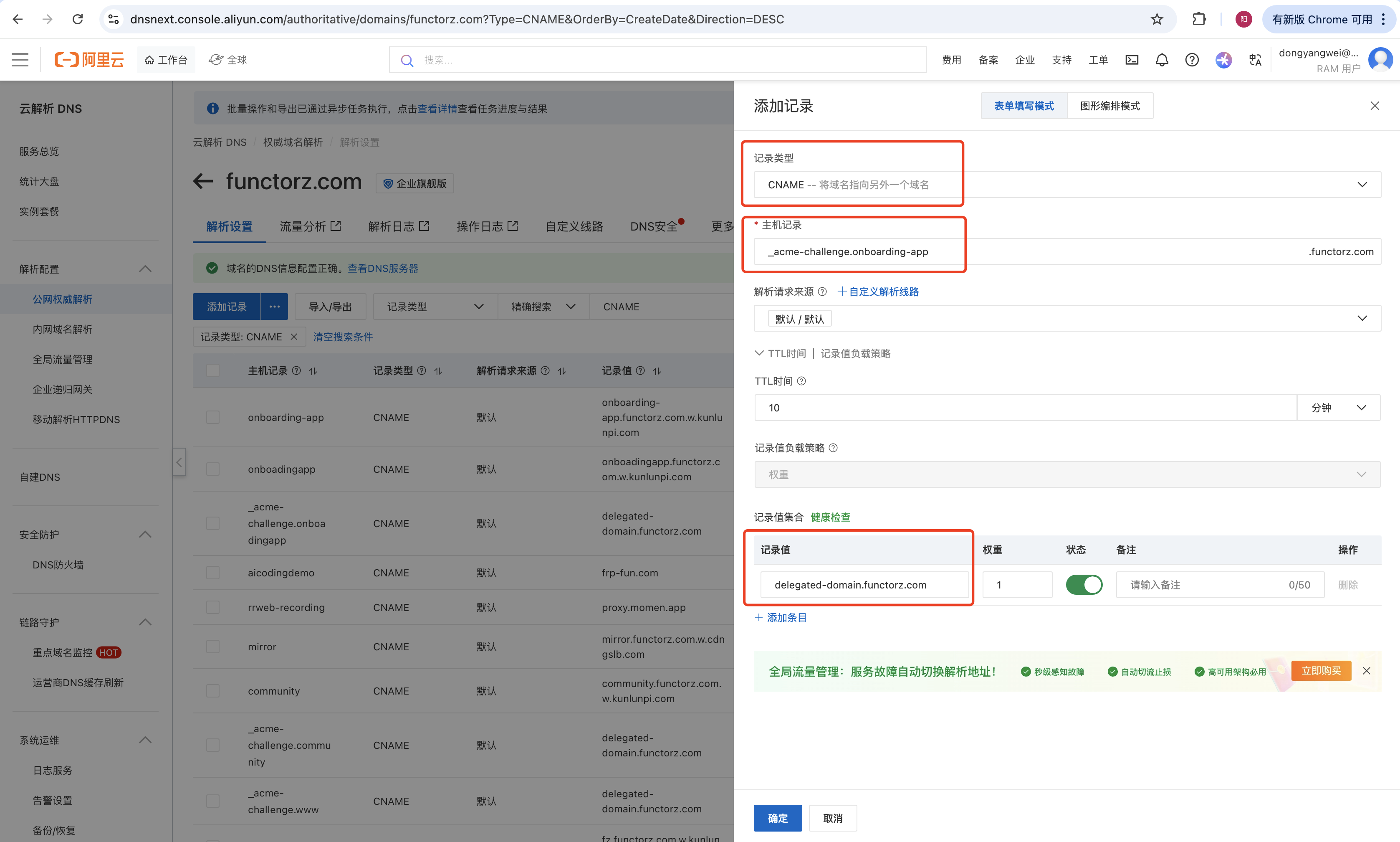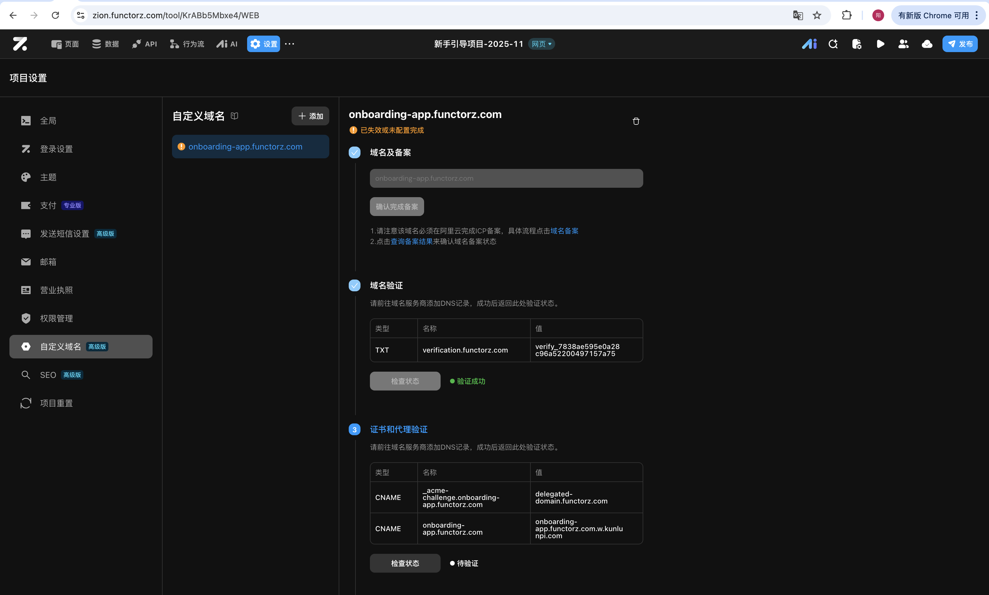 - 以添加’onboarding-app.functorz.com’为例,根据zion自定义域名配置中的步骤显示来添加记录,记录类型选择’TXT’,主机记录填写’verification’,记录值复制页面上显示的值去填写,TTL时间一般10分钟即可,解析请求来源选默认,添加完成后点击’检查状态’,显示’验证成功’配置下一步。