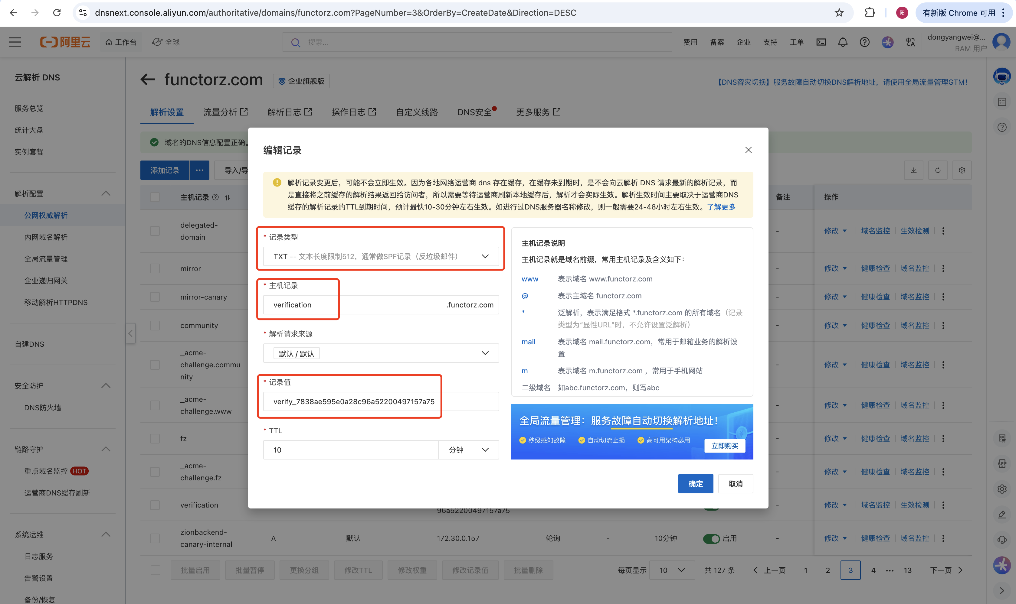 备案验证后,Zion 平台会自动生成相关验证记录,用户需前往阿里云的云解析DNS-解析配置-公网权威解析,选择域名进行解析设置。