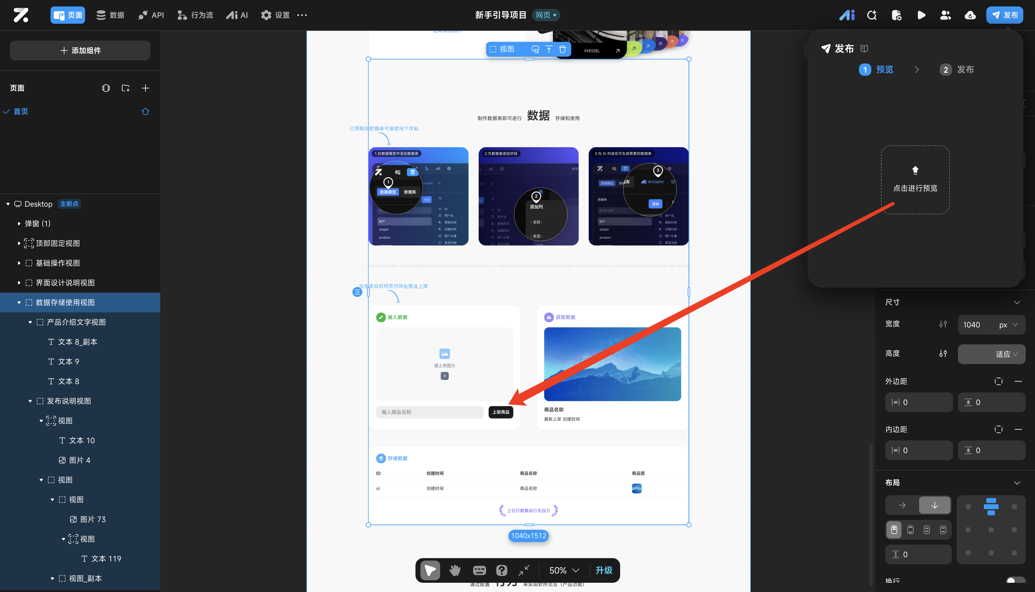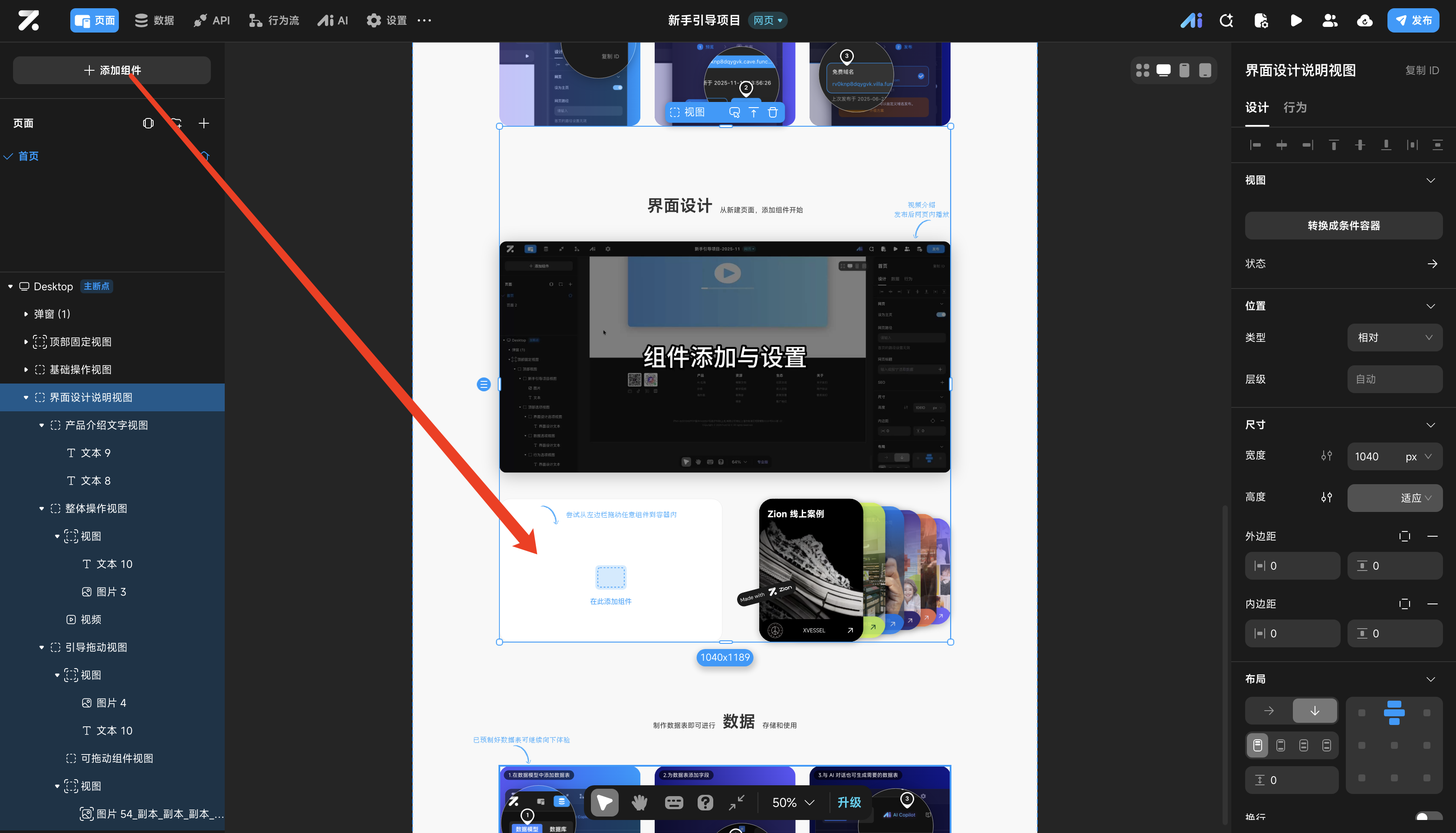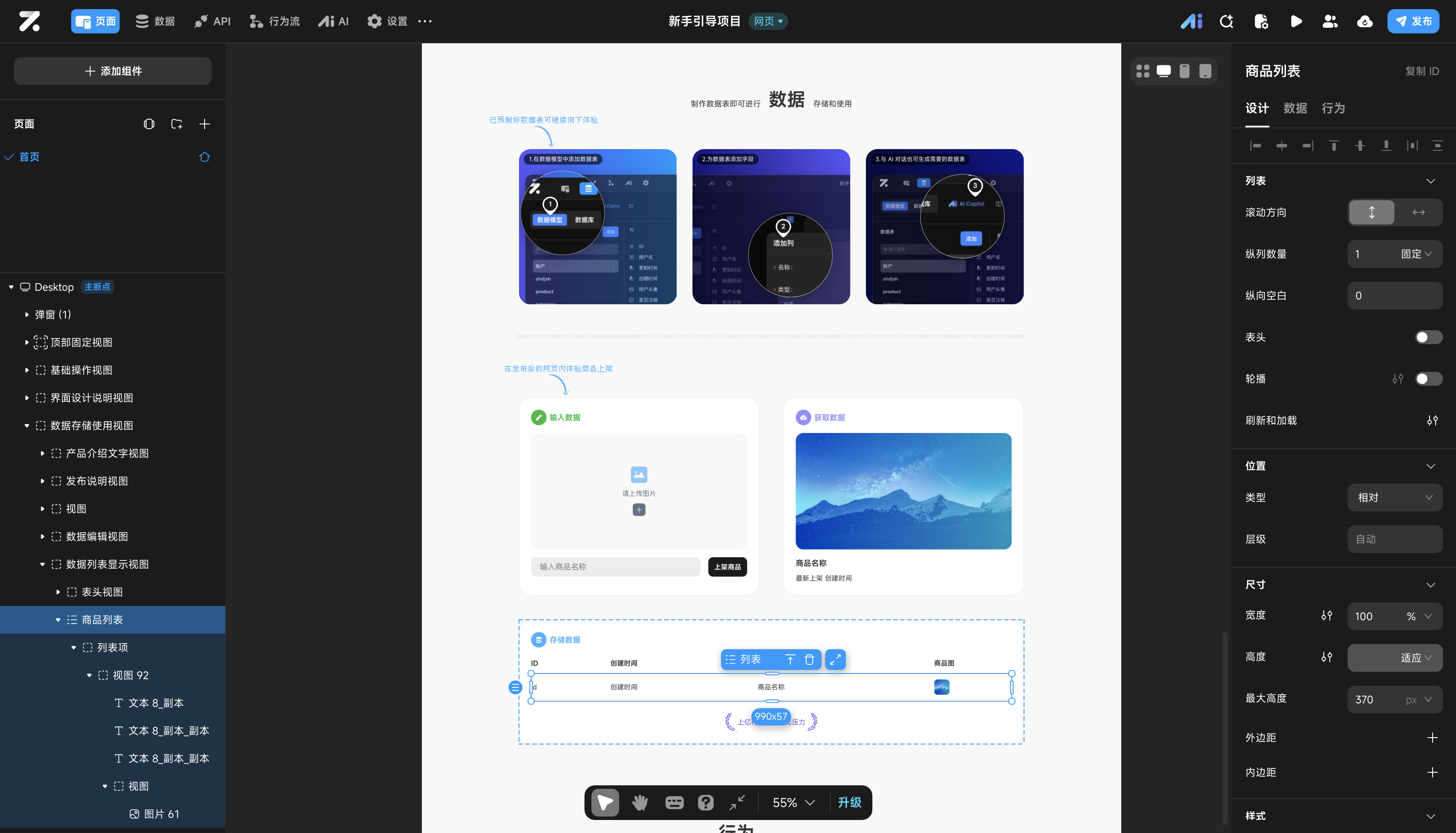 - 左侧栏(导航 / 组件树):添加组件、管理页面和组件结构。您可以尝试点击“首页”下的不同视图(如“数据存储使用视图”),切换教学场景。