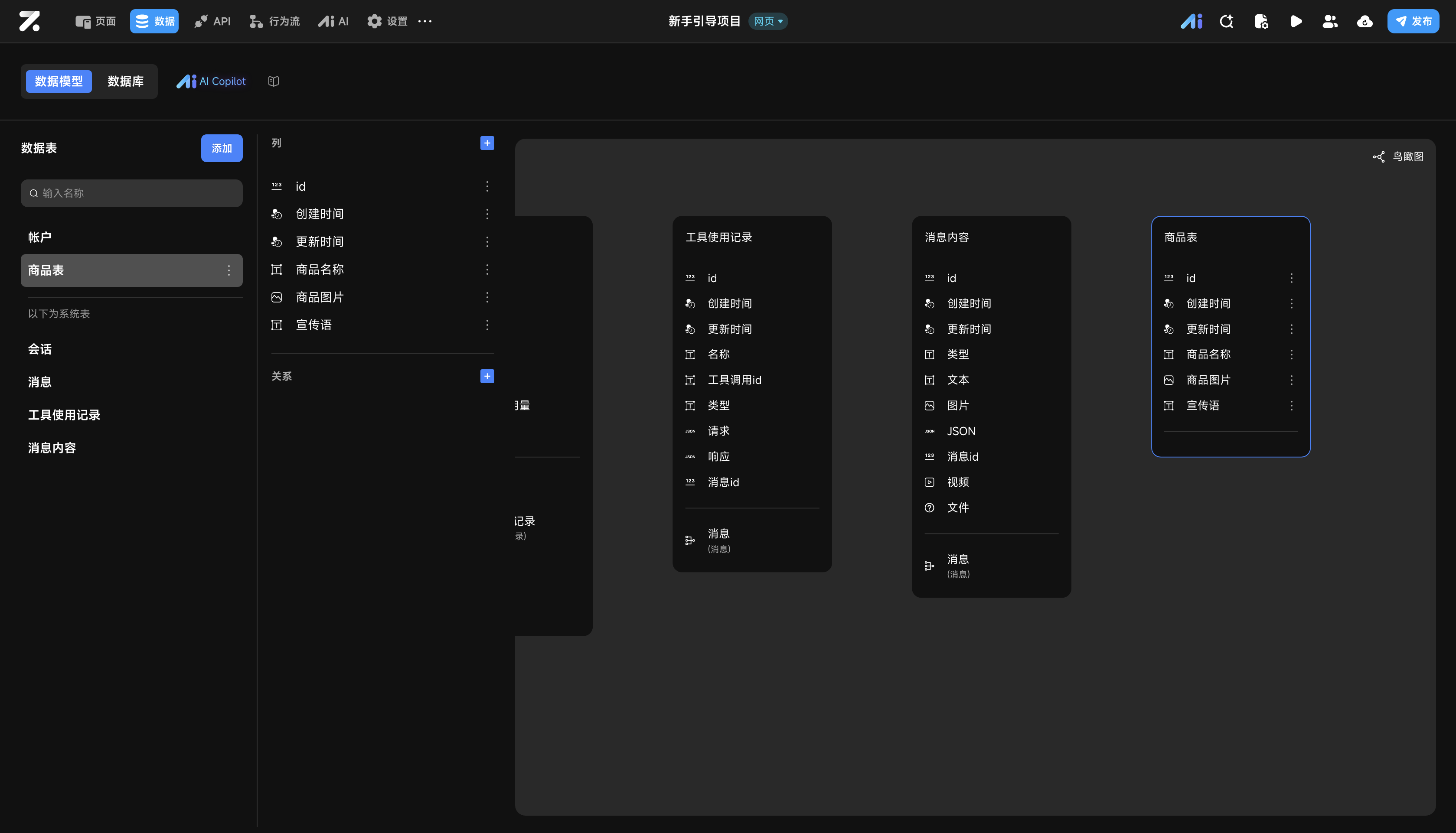 - 项目实战:在左上角 [数据] 模块中,可查看「商品表」的结构及其样例数据。它包含商品名称、商品图片以及一个特殊的“宣传语”字段。