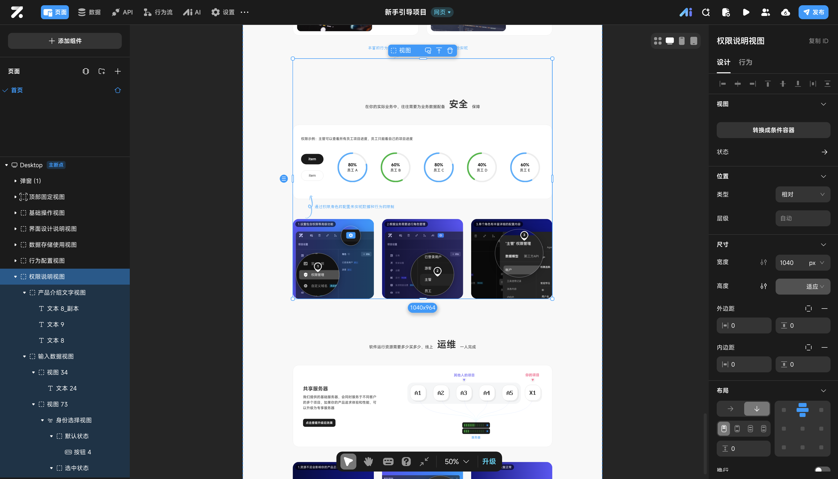- 右侧属性面板(核心配置):选中任意组件后,在这里配置其**“设计”(长什么样)、“数据”(显示什么数据)和“行为”**(点击后发生什么)。