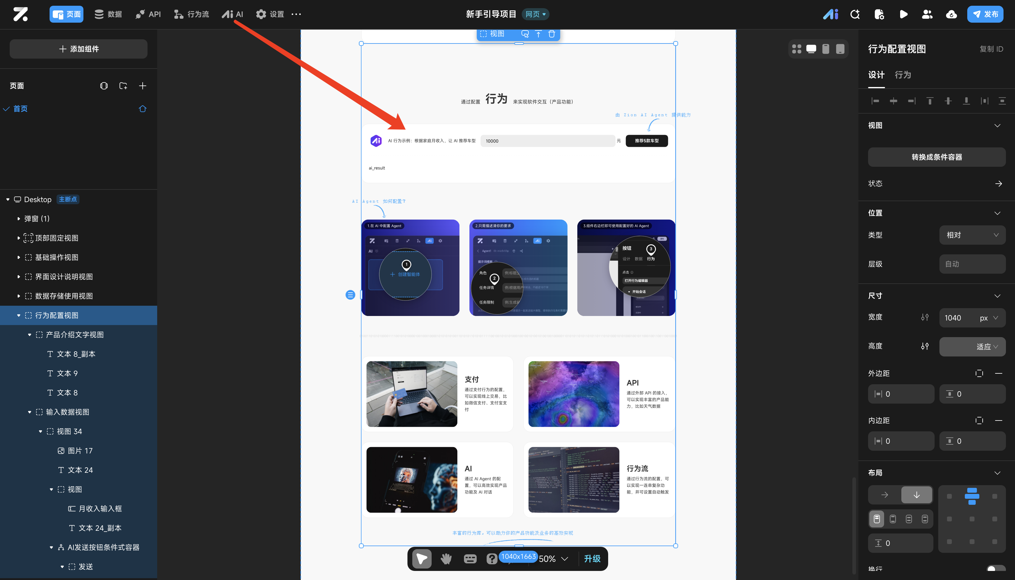 - 顶部右侧导航(运行发布):包括 AI 助手(实时答疑)、组件搜索、实时预览(真实跑通逻辑)、日志查询、后端同步变更(部署数据模型、行为流、API),以及发布。